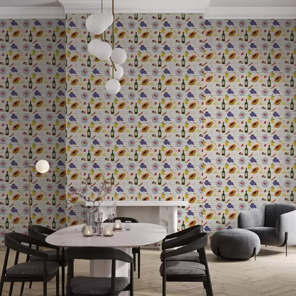 Tapety Grafika kuchenna z owocami, szklankami i talerzami Nr. a00638