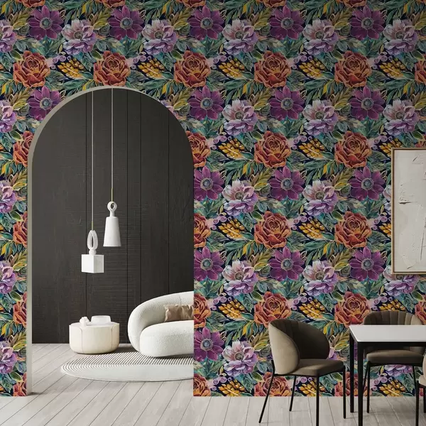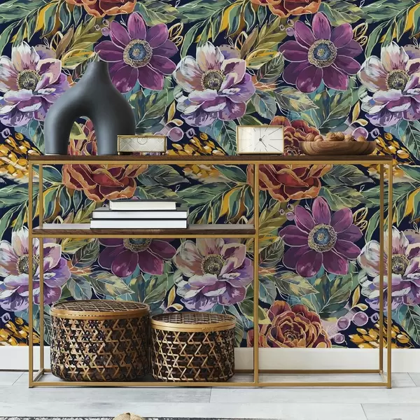Tapety Wyraziste, duże kwiaty namalowane pędzlem na ciemnoniebieskim tle Nr. a00643