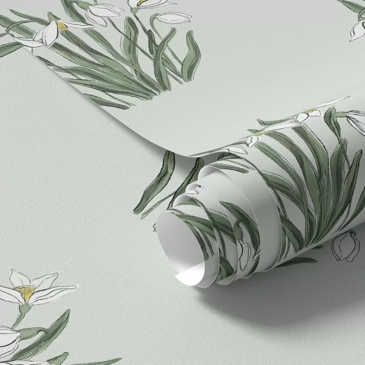 Tapety Przebiśniegi z zielonymi liśćmi na pastelowo zielonym tle Nr. a00651