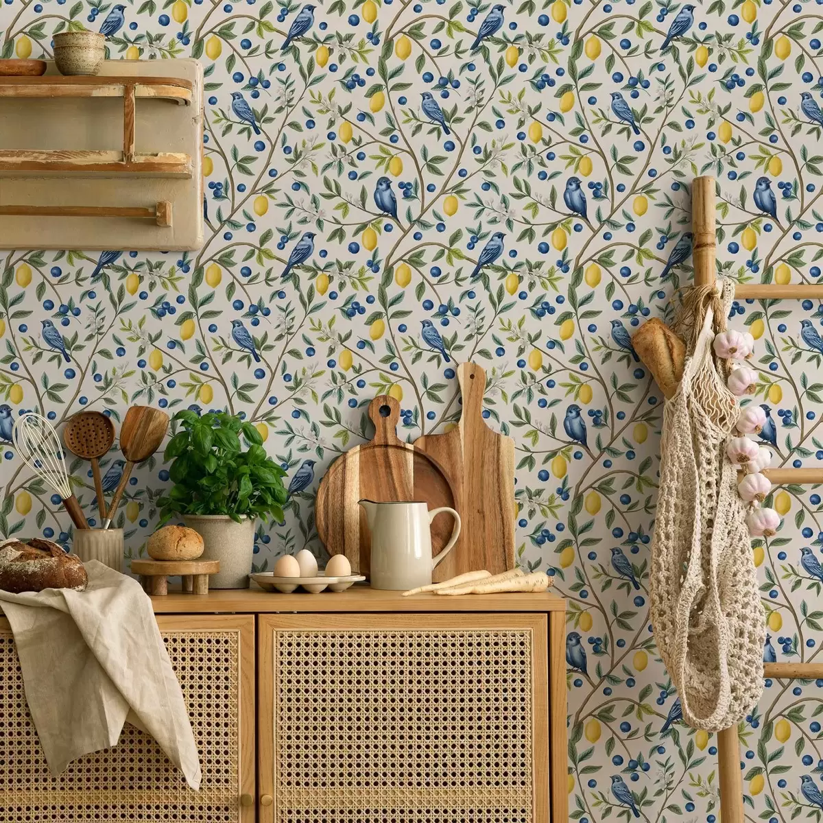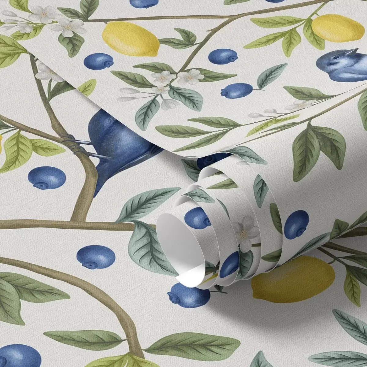 Tapety Niebieskie ptaki, cytryny i jagody na białym tle Nr. a00668