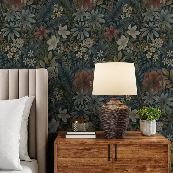 Tapety Ciemne tło z gęstymi kwiatami i liśćmi w ciepłych odcieniach Nr. a00678