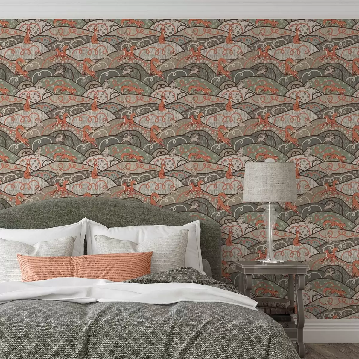 Tapety Lisy i zające na falistych wzgórzach, wzór retro Nr. a00690