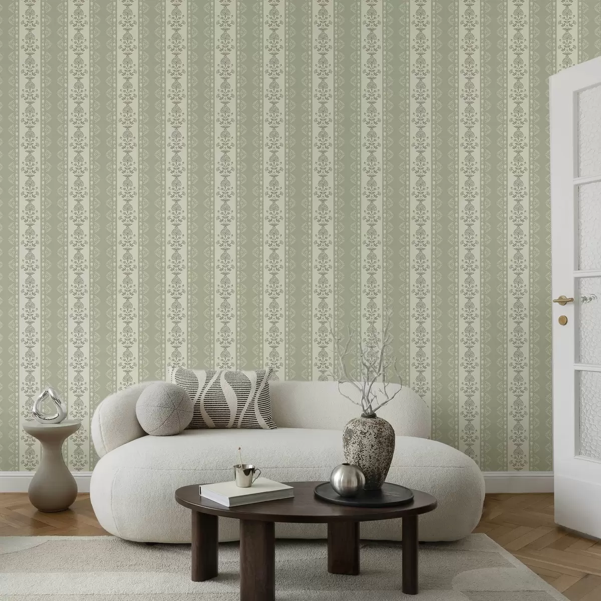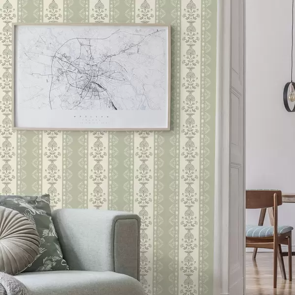 Tapety Ornament w paski z kwiatowymi kolumnami w odcieniach szałwii Nr. a00719