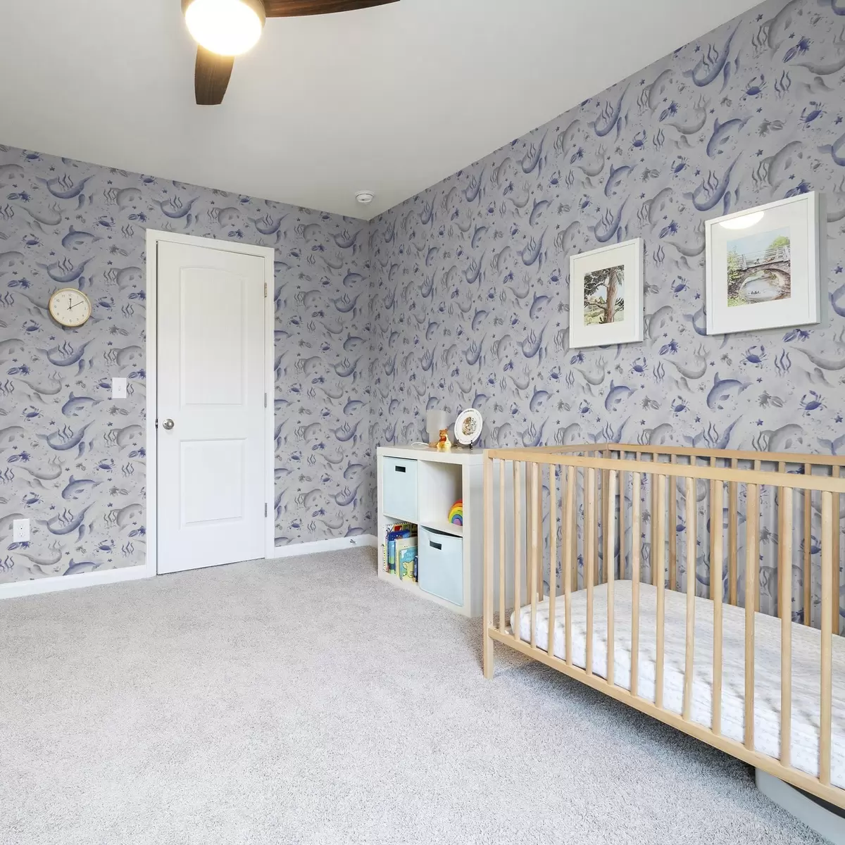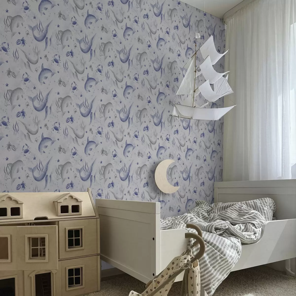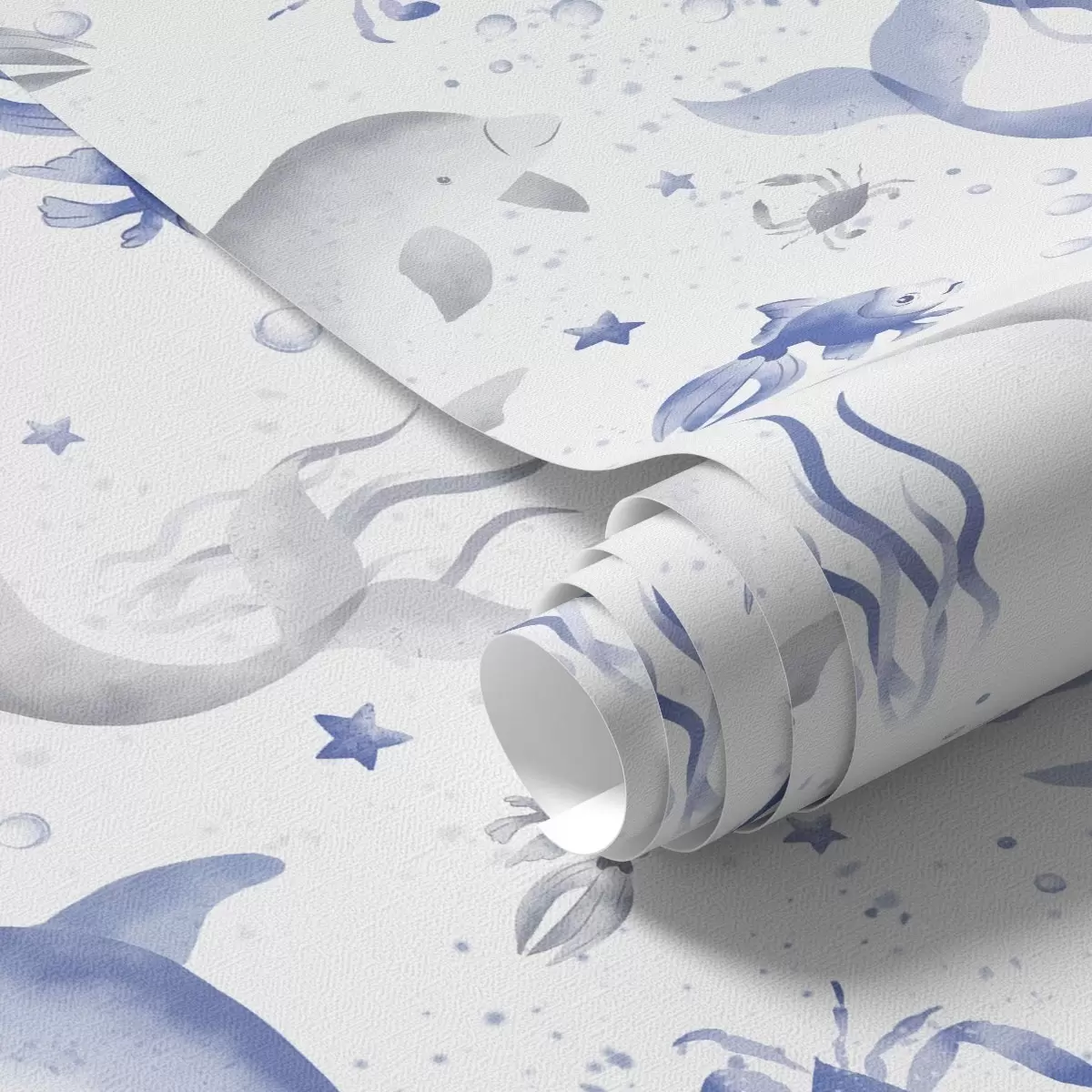Tapety Wieloryby morskie i delfiny w odcieniach niebieskiego na białym tle Nr. a00720v1