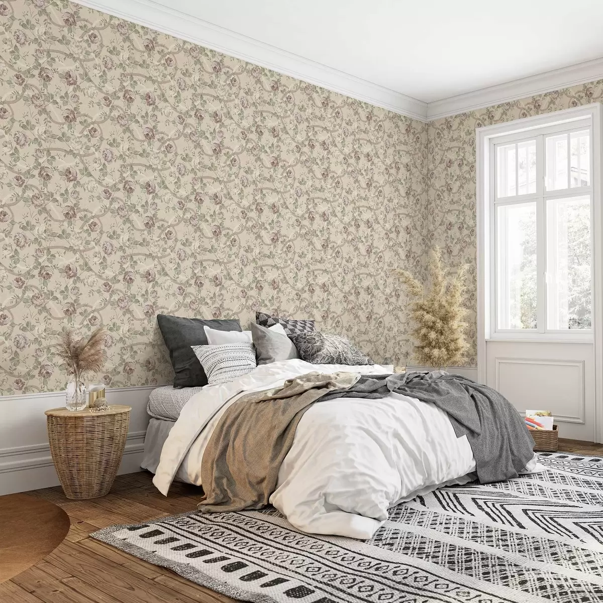 Tapety Róże z zielonymi liśćmi na ciepłym beżowym tle Nr. a00729