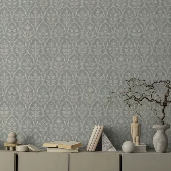 Tapety Miętowy adamaszek z delikatnymi kwiatowymi medalionami Nr. a00741