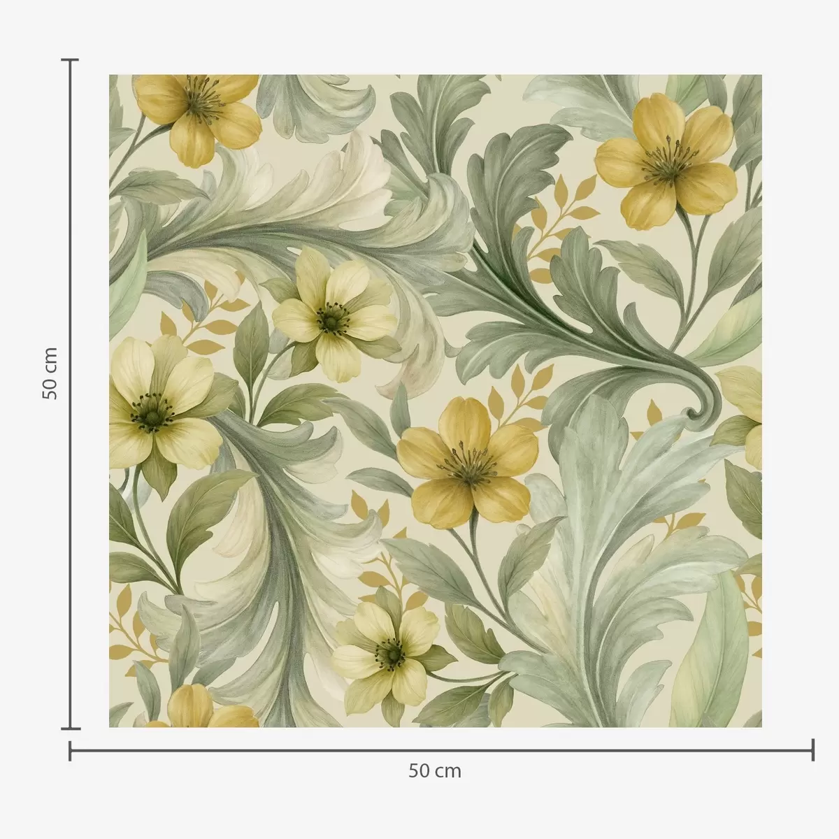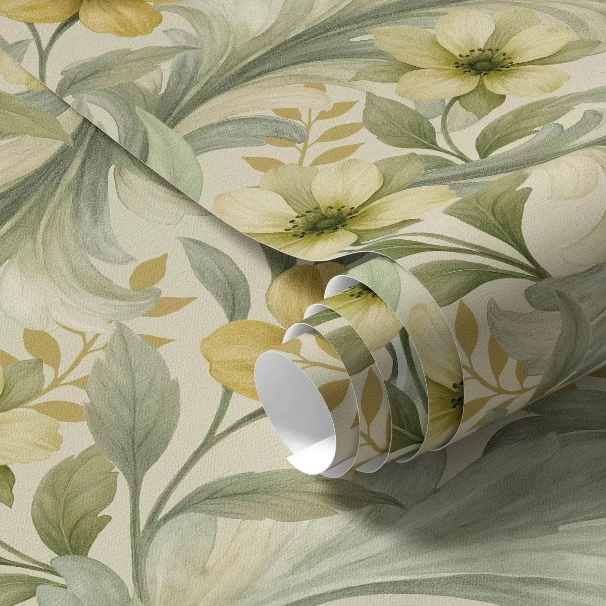 Tapety Akantowe zawijasy z kwiatami w odcieniach zieleni i żółci Nr. a00749