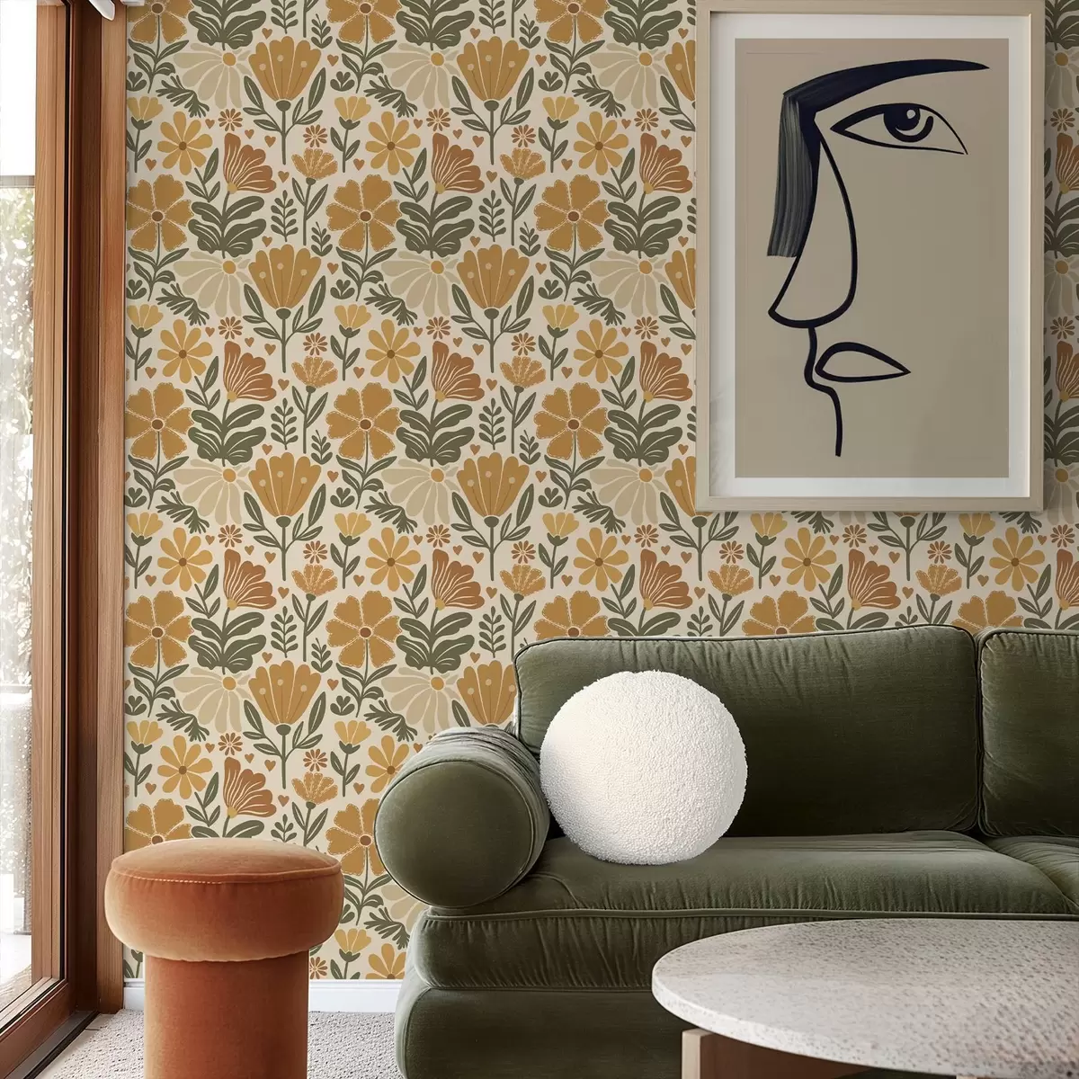 Tapety Stylizowane kwiaty w ciepłych odcieniach z sercami Nr. a00752