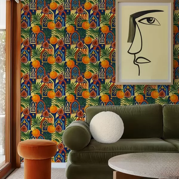 Tapety Jasne pomarańcze, liście palmowe i marokańskie łuki Nr. a00767