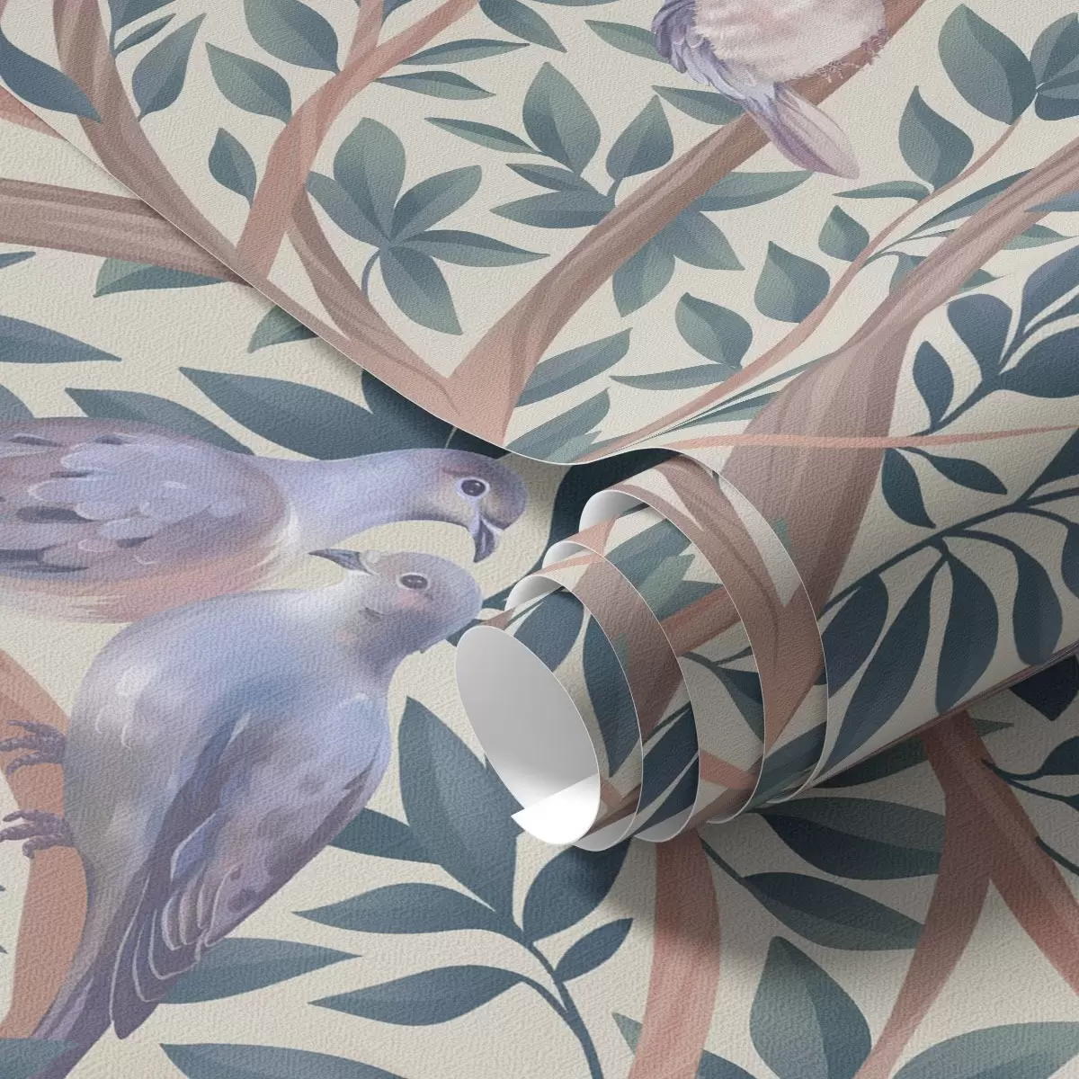 Tapety Gołębie wśród gałęzi i liści w delikatnej pastelowej palecie barw Nr. a00796