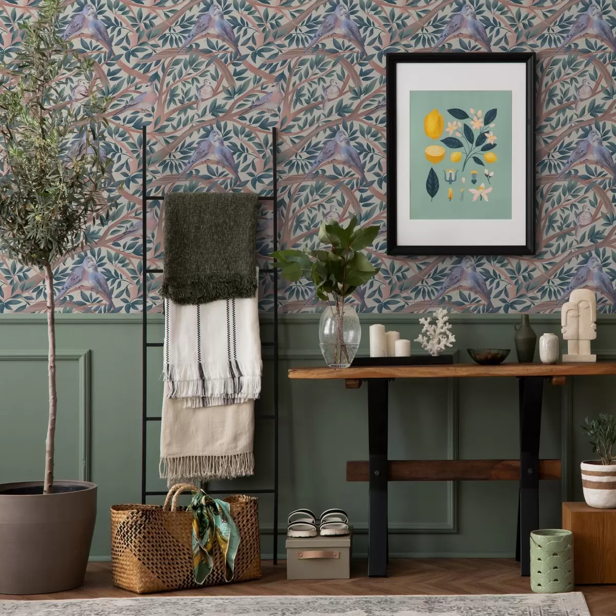 Tapety Gołębie wśród gałęzi i liści w delikatnej pastelowej palecie barw Nr. a00796