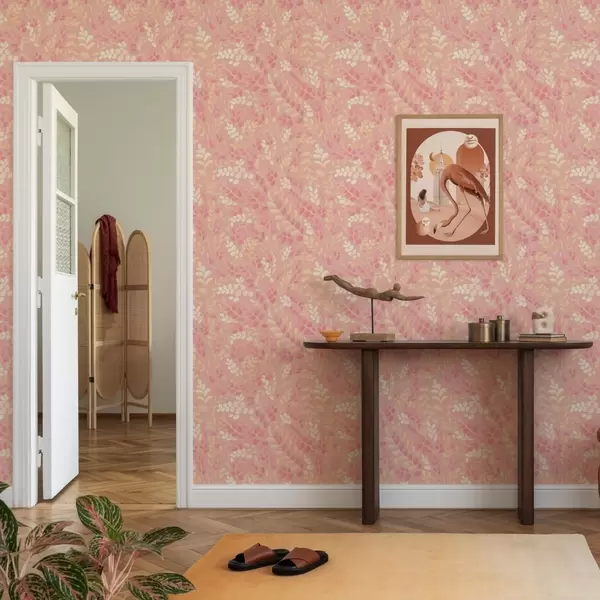 Tapety Delikatne liście w kolorze różowo-brzoskwiniowym z delikatnym połyskiem Nr. a00799