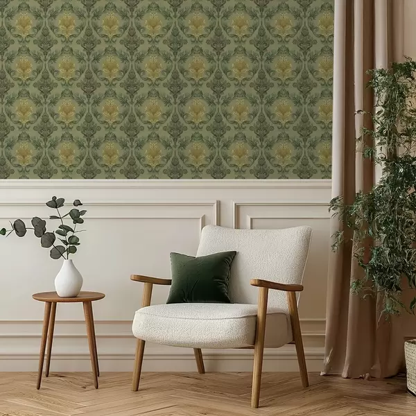 Tapety Damaszek z roślinnymi wzorami, paleta kolorów oliwkowo-ochrowych Nr. a00828