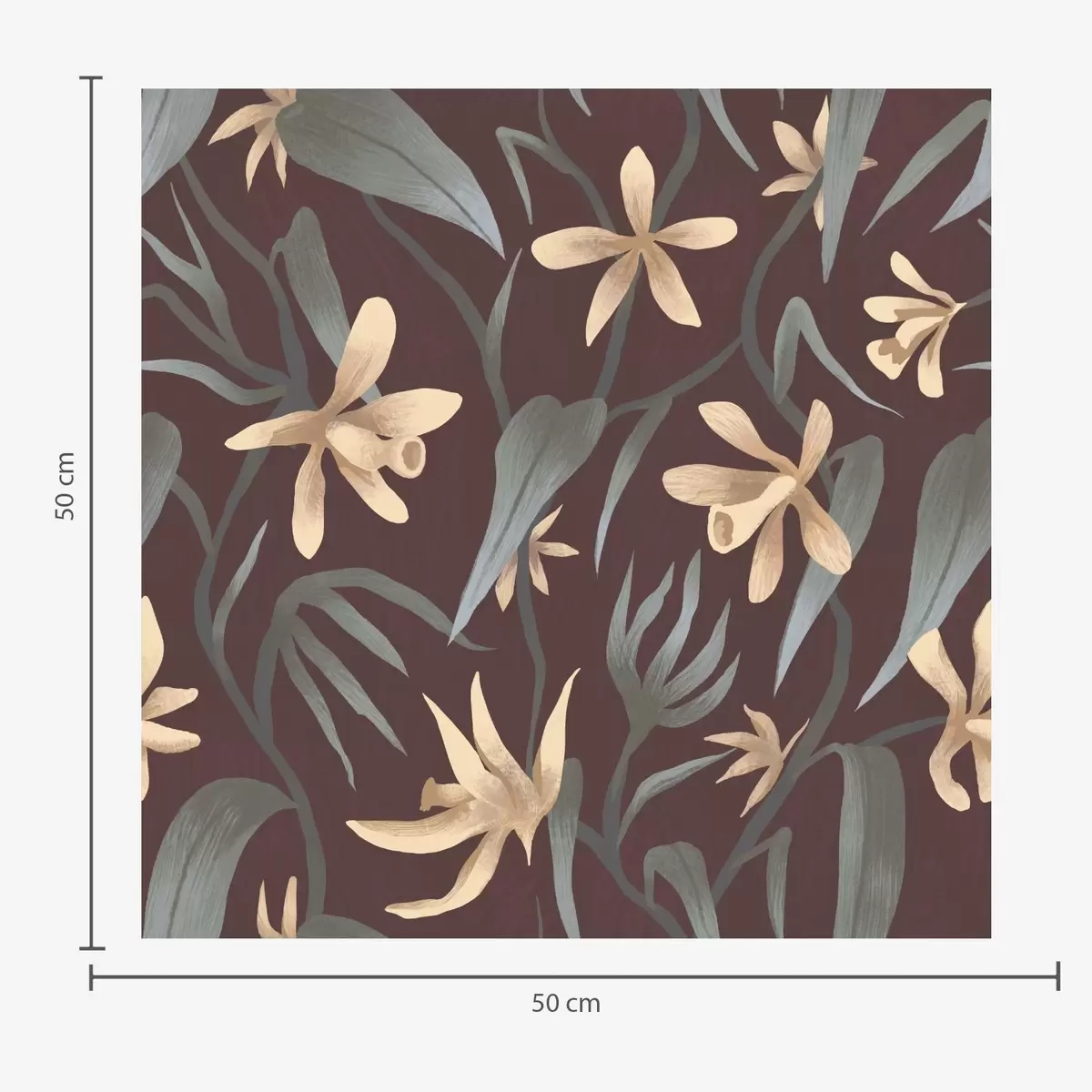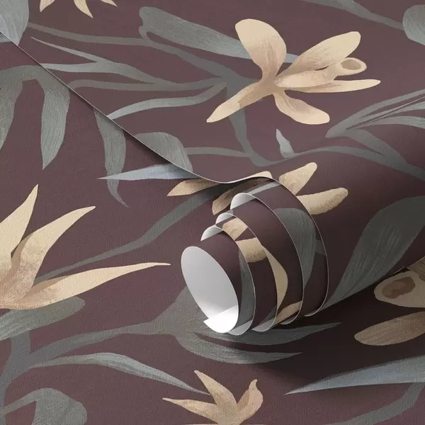 Tapety Kremowe kwiaty z szarymi liśćmi na bordowym tle Nr. a00833