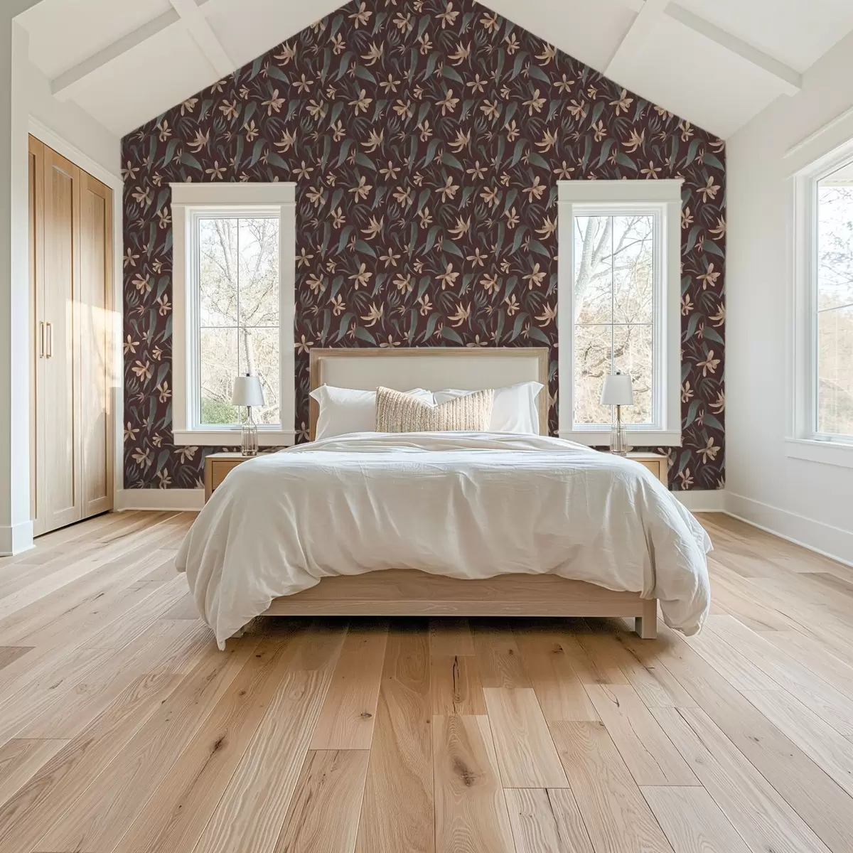 Tapety Kremowe kwiaty z szarymi liśćmi na bordowym tle Nr. a00833