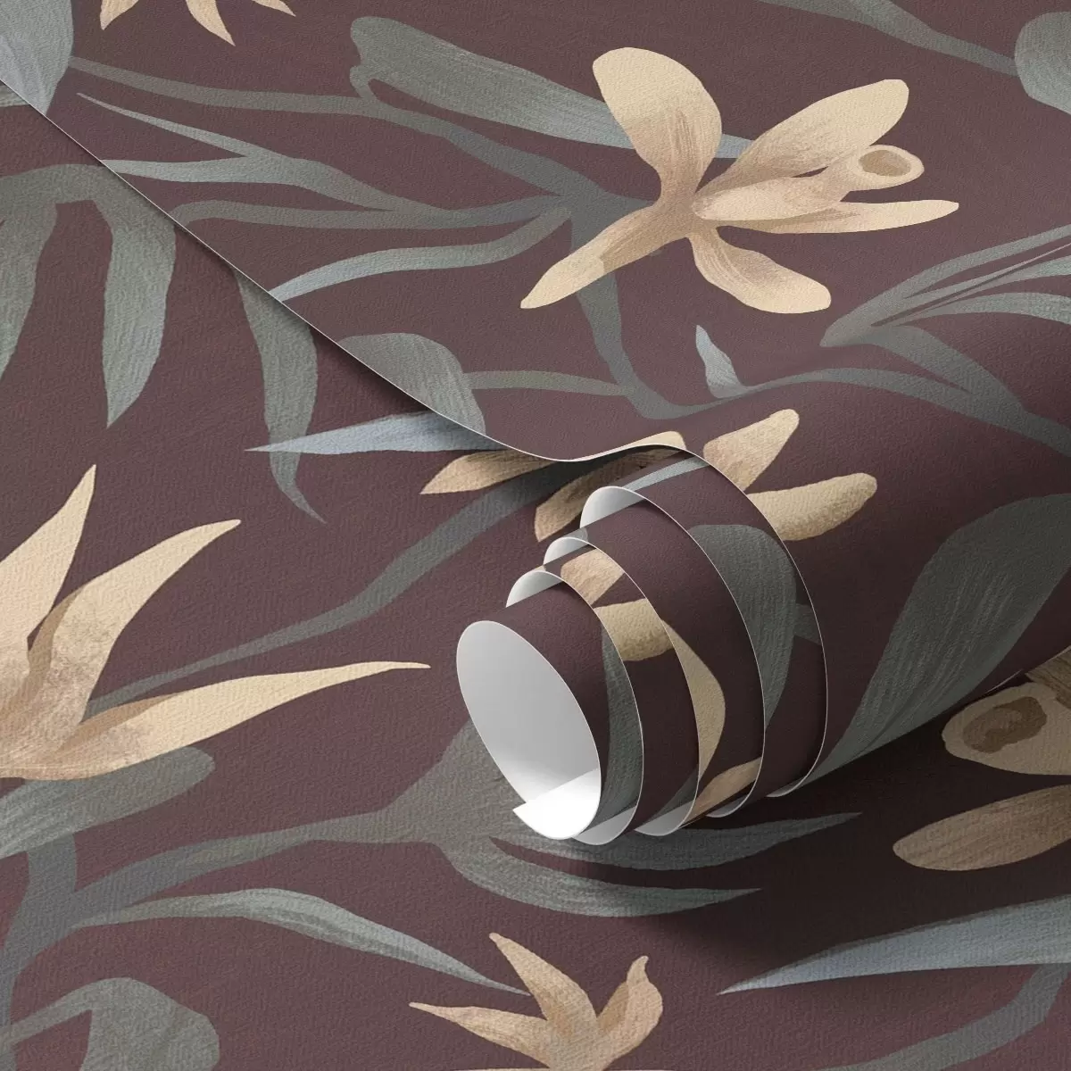 Tapety Kremowe kwiaty z szarymi liśćmi na bordowym tle Nr. a00833