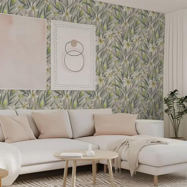 Tapety Kremowe lilie z liśćmi na szaro-beżowym tle Nr. a00837