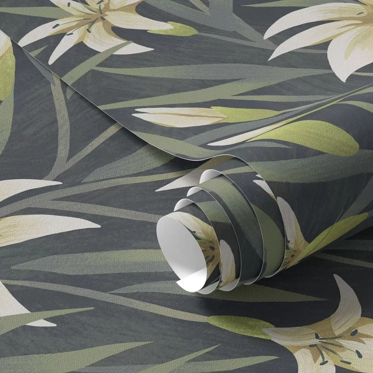Tapety Kremowe lilie z liśćmi na ciemnym tle Nr. a00837v1