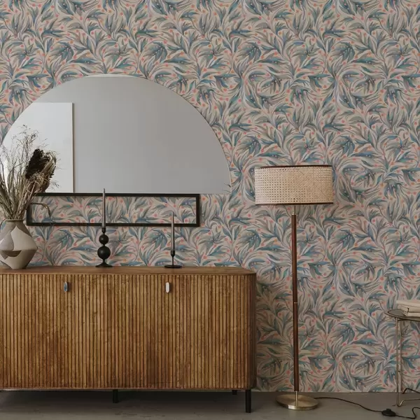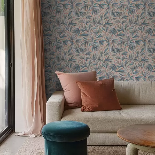Tapety Abstrakcyjne niebieskie liście z koralowymi kwiatami Nr. a00852