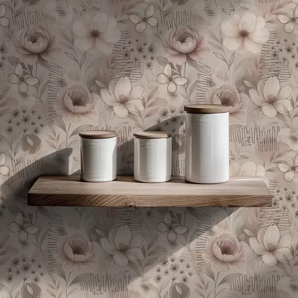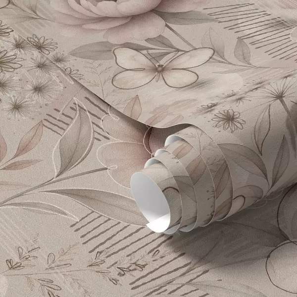 Tapety Sepia beżowe kwiaty z motylami i liniowymi akcentami Nr. a00870