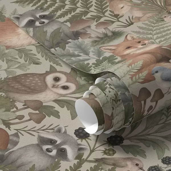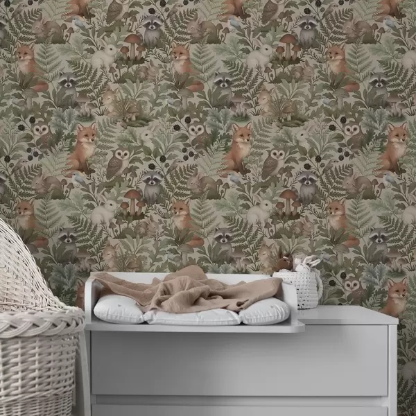 Tapety Leśne zwierzęta, paprocie i grzyby na jasnobeżowym tle Nr. a00880v1