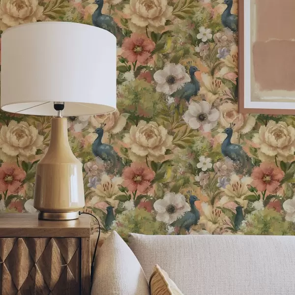 Tapety Malowniczy ogród z pawiami i dużymi kwiatami Nr. a00885