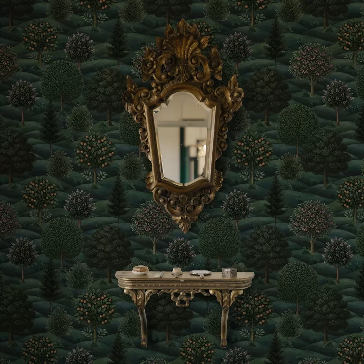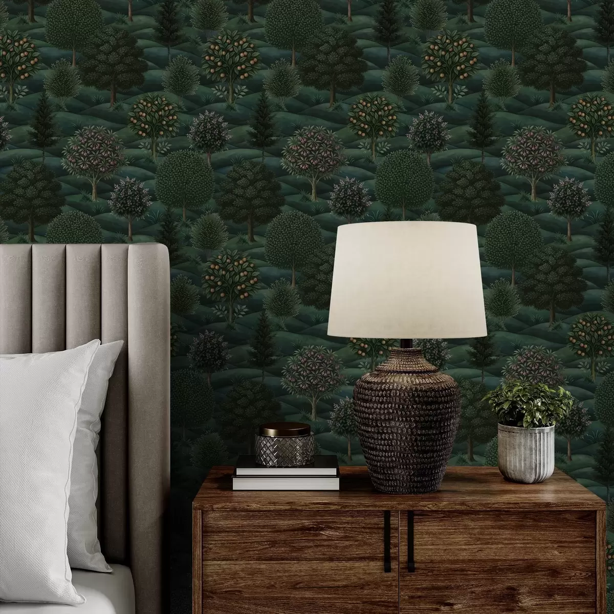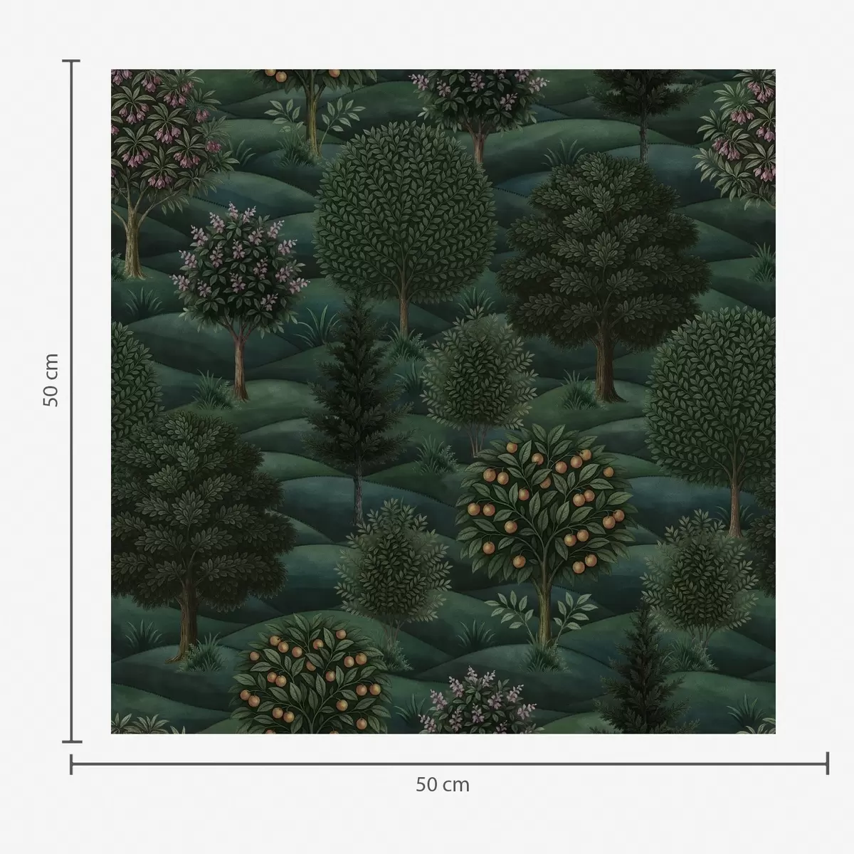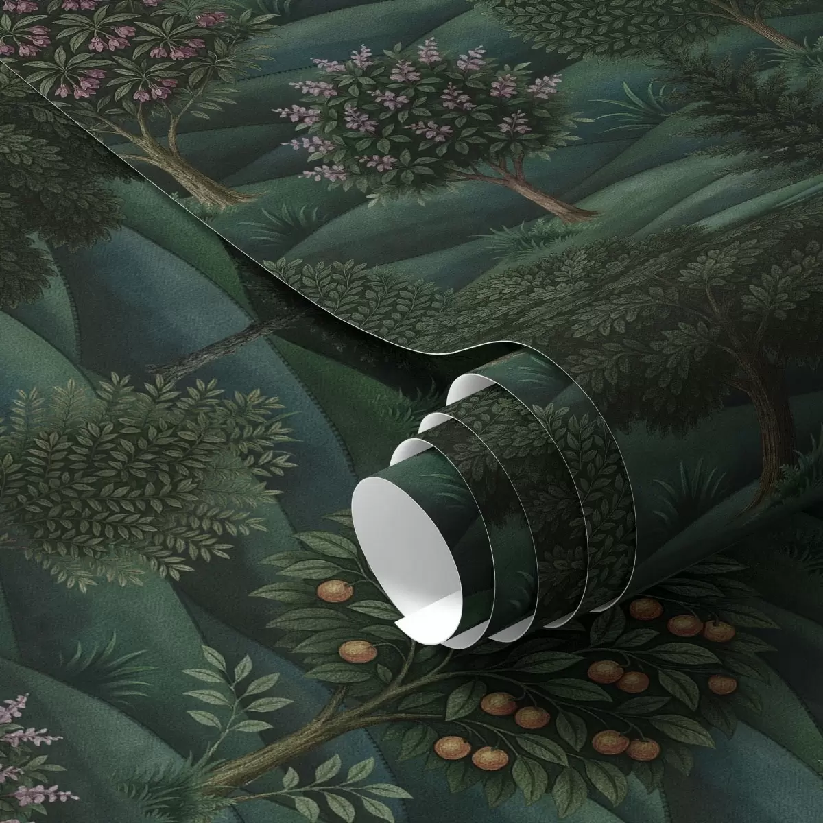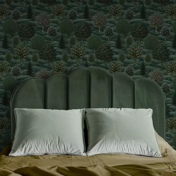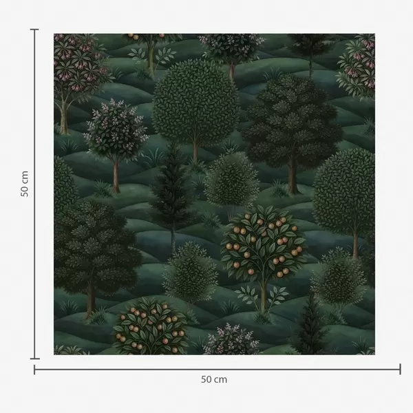 Tapety Bogaty, zielony, falisty krajobraz z wzorzystymi drzewami Nr. a00892