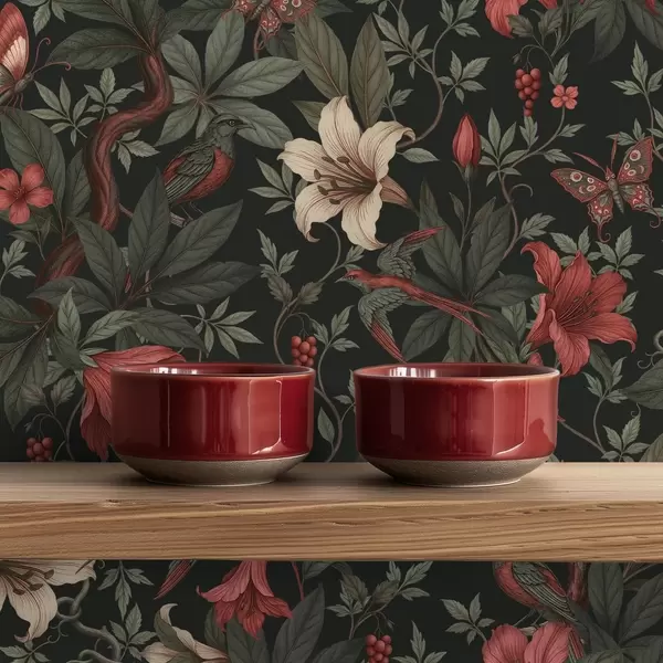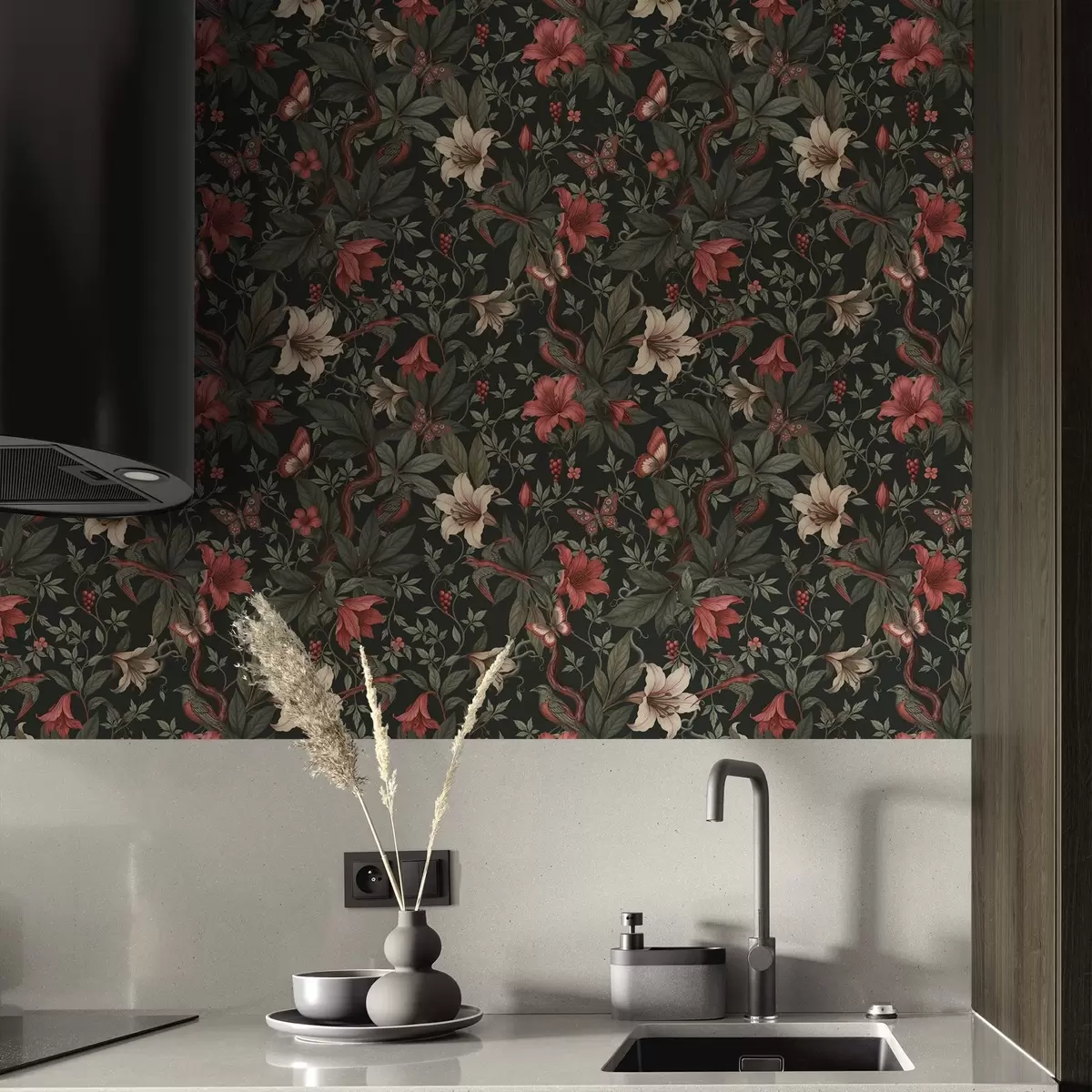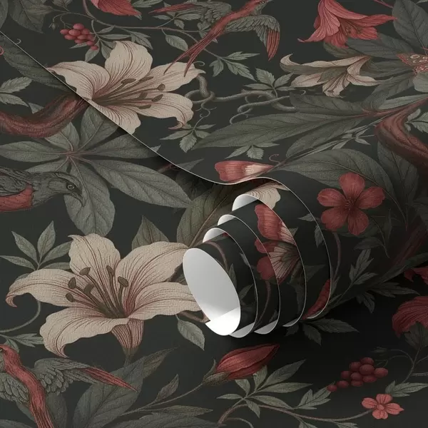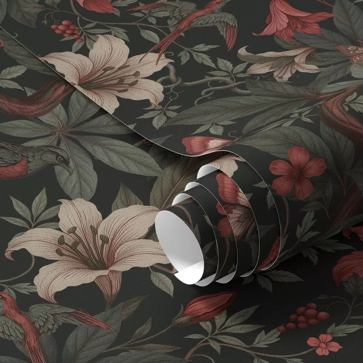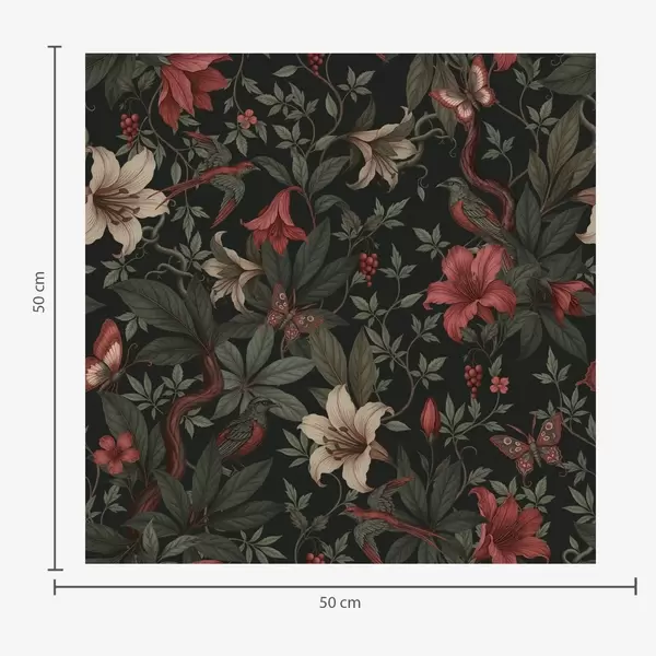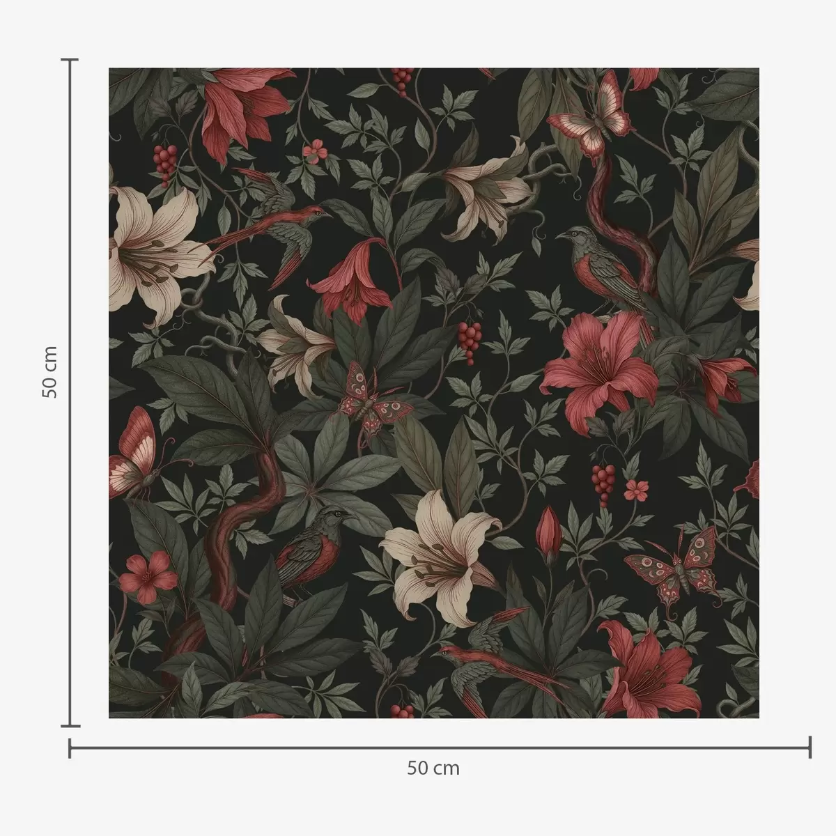 Tapety Ciemne kwiaty z dżungli z ptakami i motylami Nr. a00895