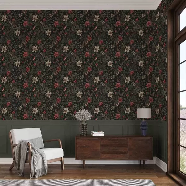 Tapety Ciemne kwiaty z dżungli z ptakami i motylami Nr. a00895