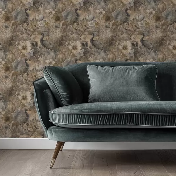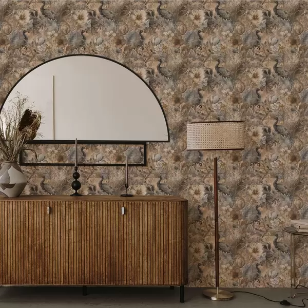 Tapety Postarzana kwiatowa kolaż z pawiami i motylami Nr. a00897