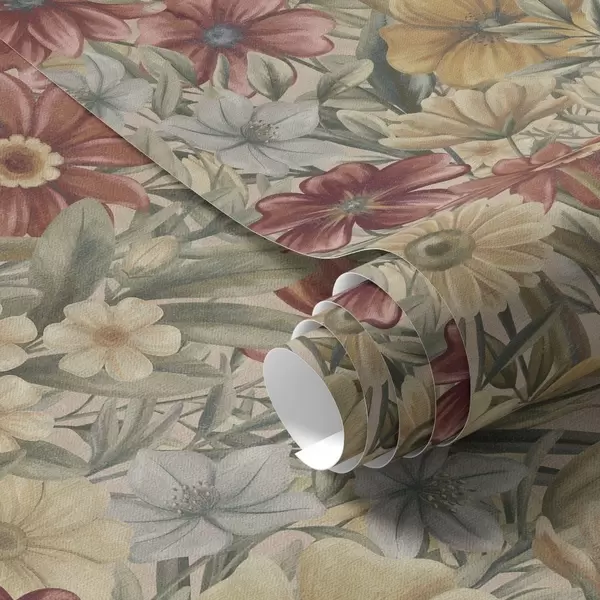 Tapety Kwiaty łąkowe w stylu vintage w ciepłych odcieniach żółci, czerwieni i szałwii Nr. a00906