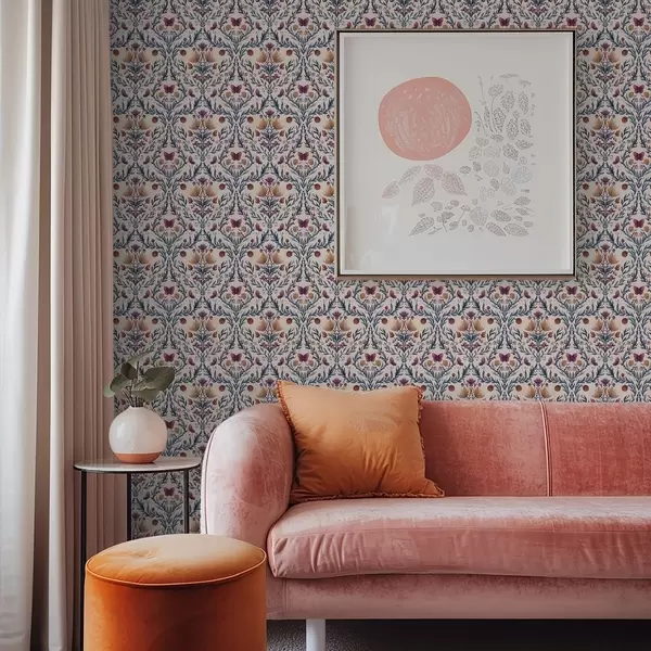 Tapety Kwiatowy adamaszek z motylami na delikatnym brzoskwiniowym tle Nr. a00926
