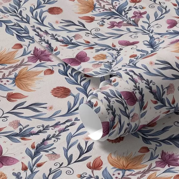 Tapety Kwiatowy wzór adamaszku z motylami w kolorze granatowym i terakotowym na białym tle Nr. a00926v1