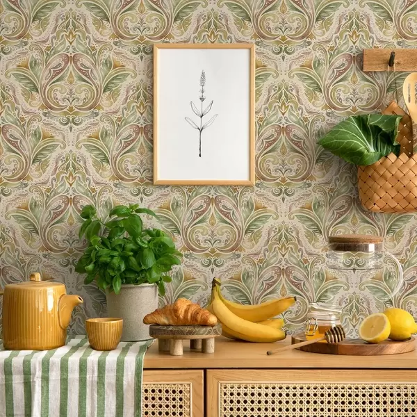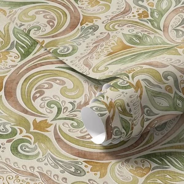 Tapety Akwarelowe liściaste zawirowania w odcieniach zieleni i ciepłej ochry Nr. a00927