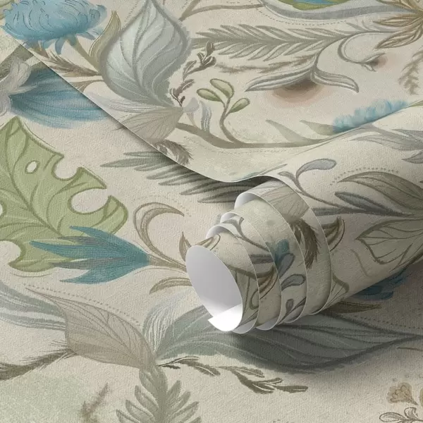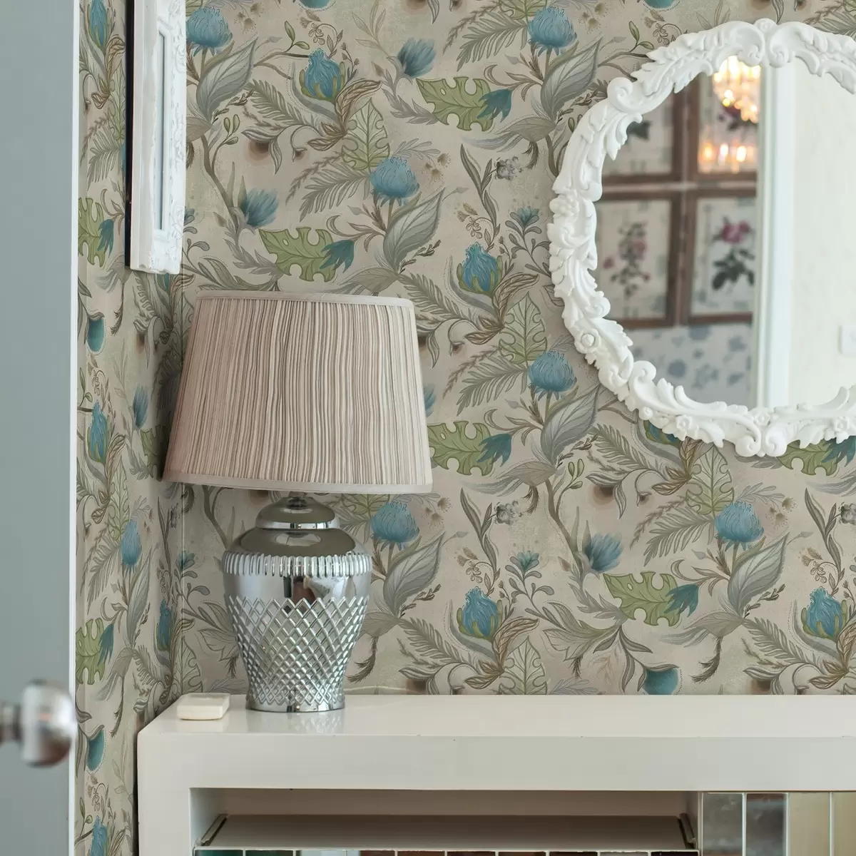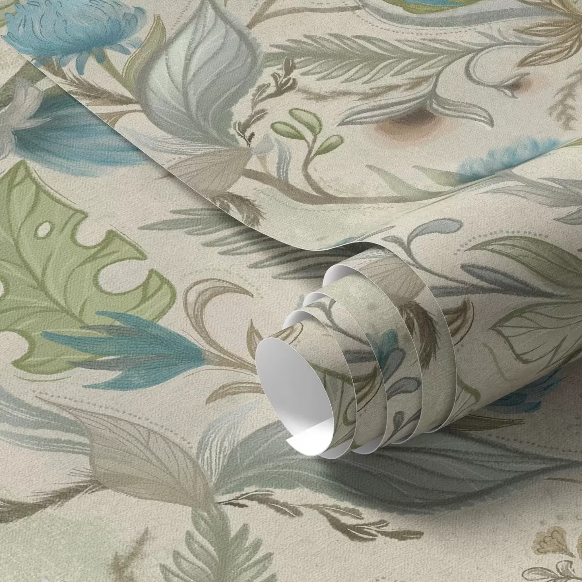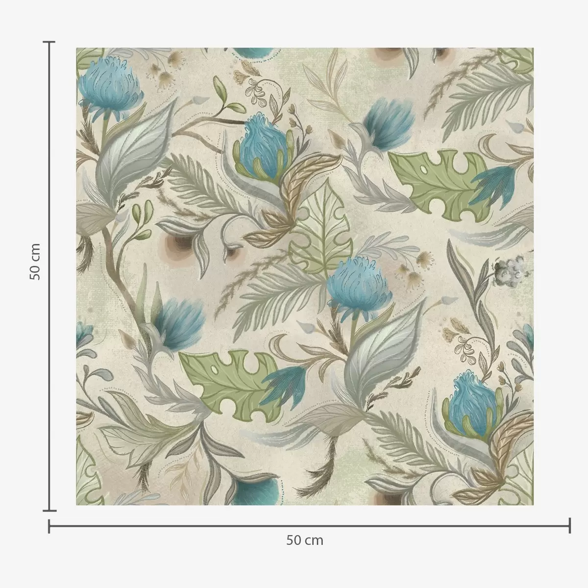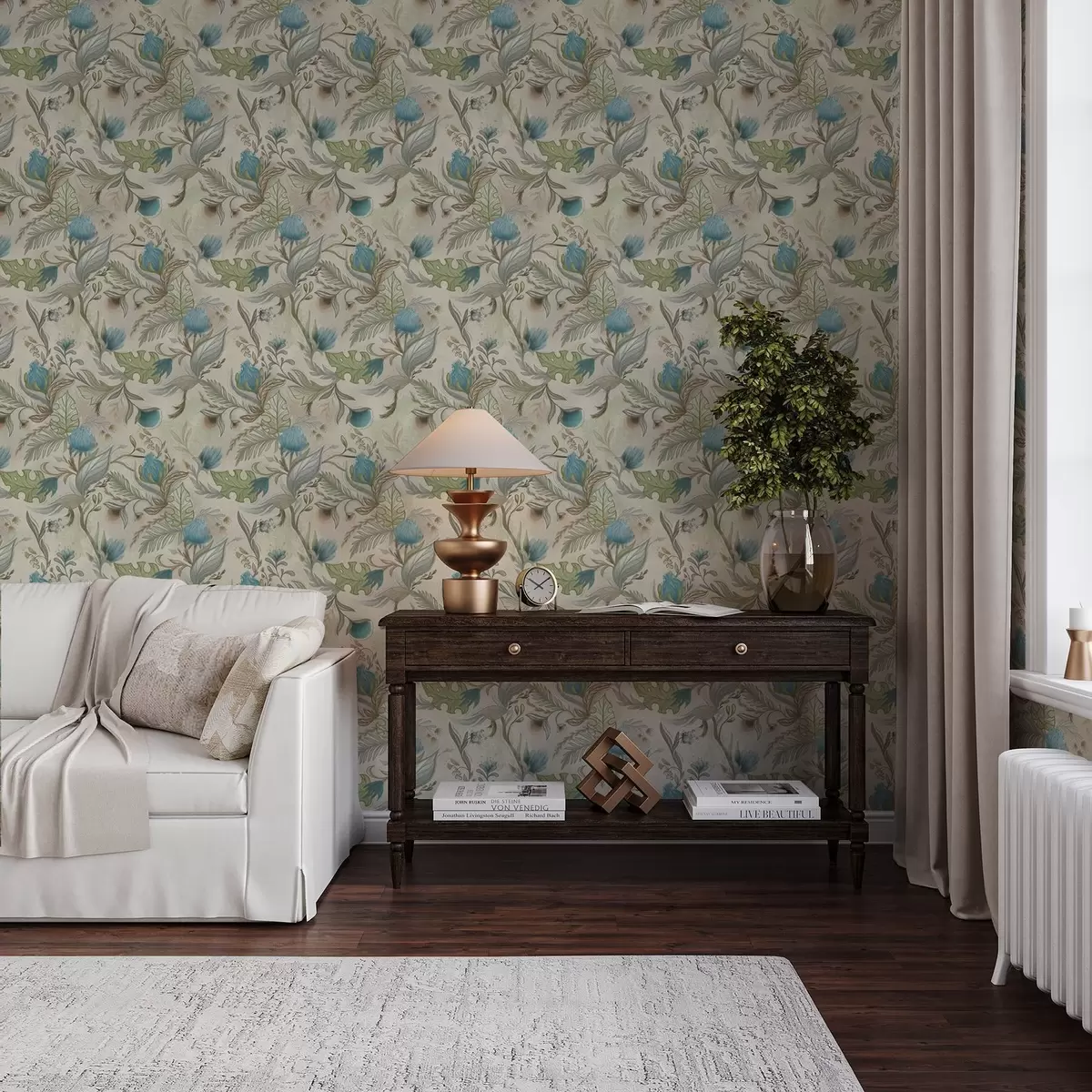 Tapety Niebieskie pąki i liście na jasnobeżowym tle Nr. a00930