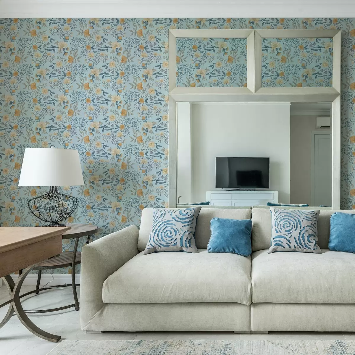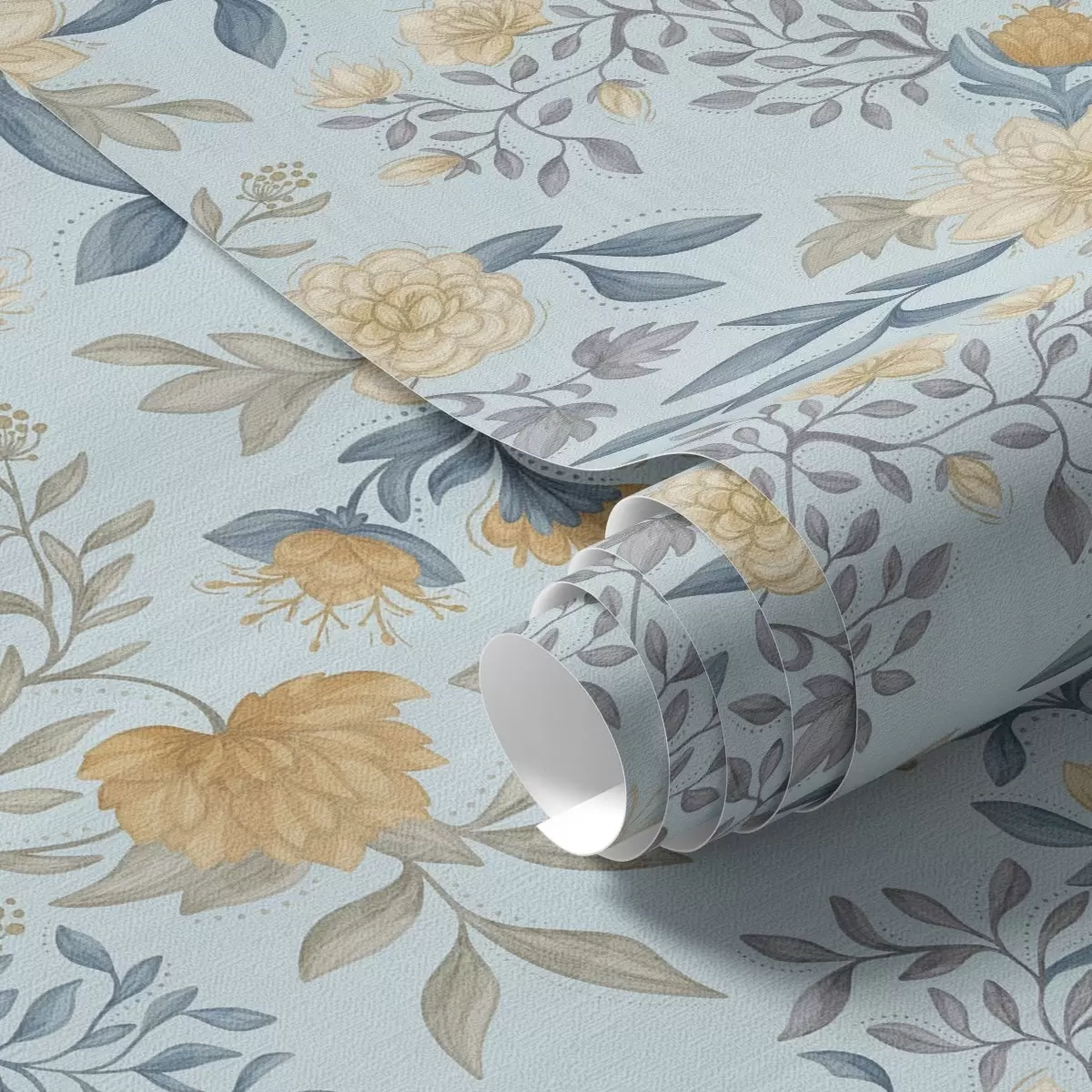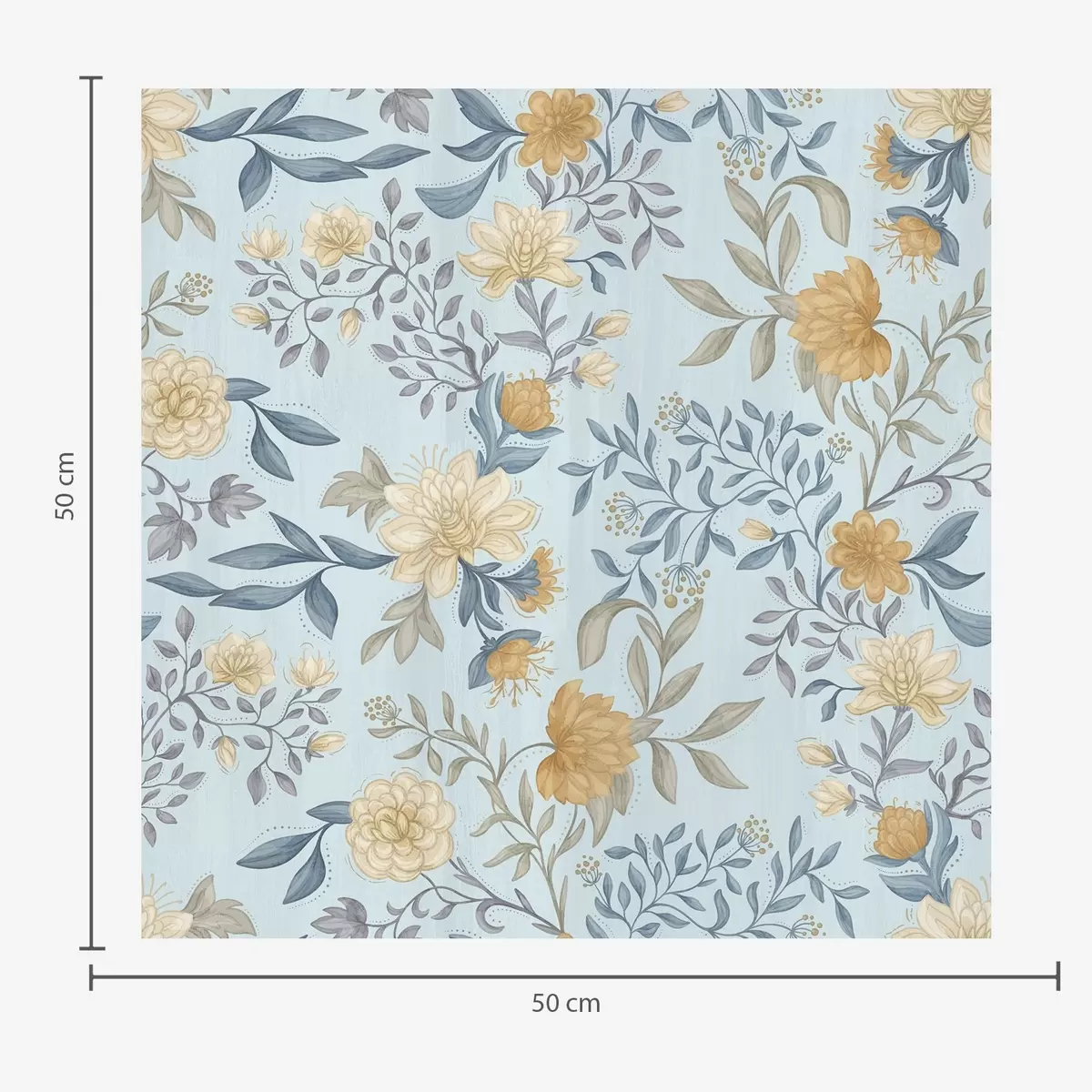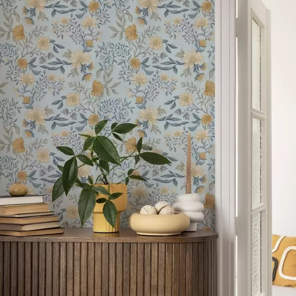 Tapety Żółte i niebieskie kwiaty z liśćmi na błękitnym tle Nr. a00934