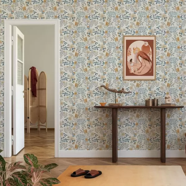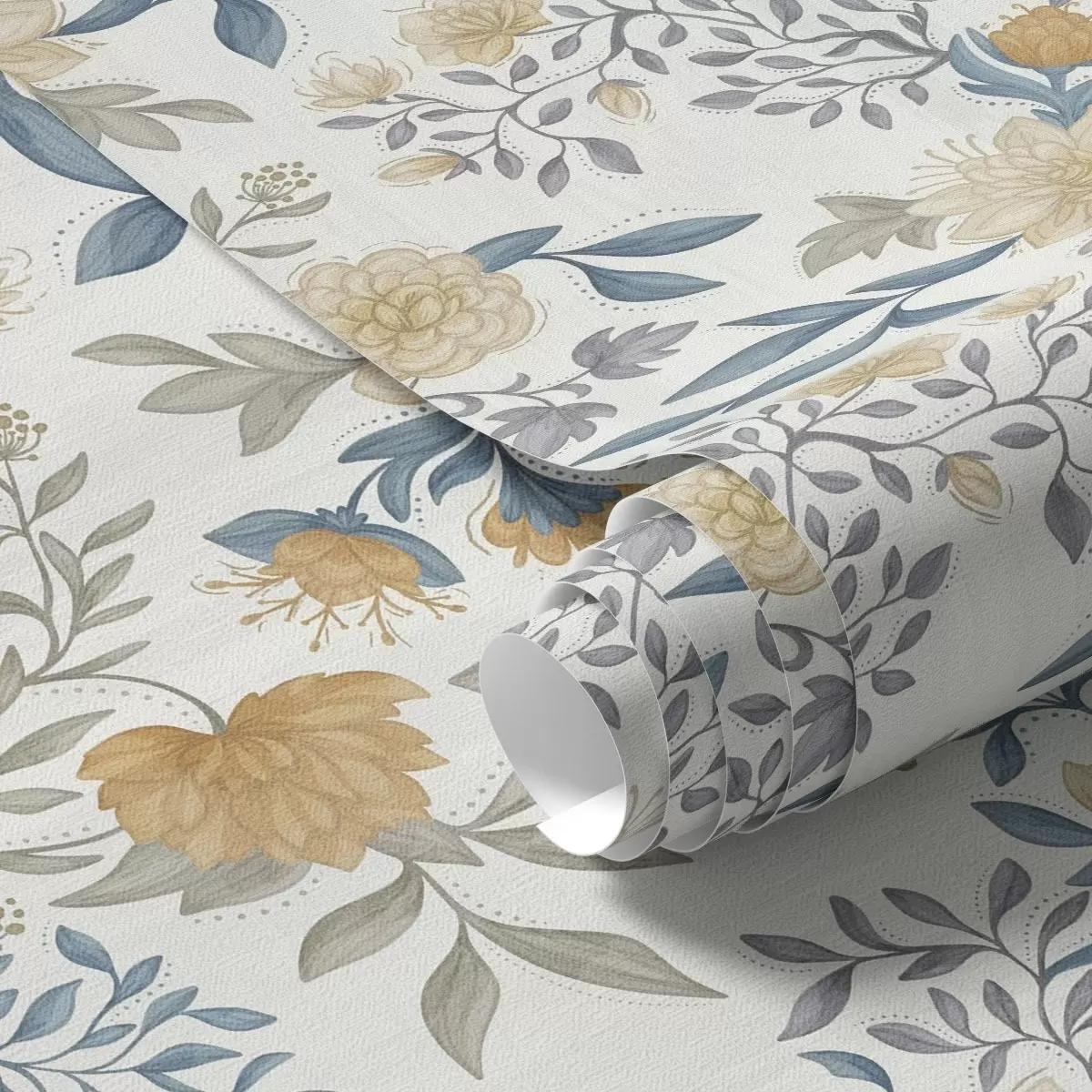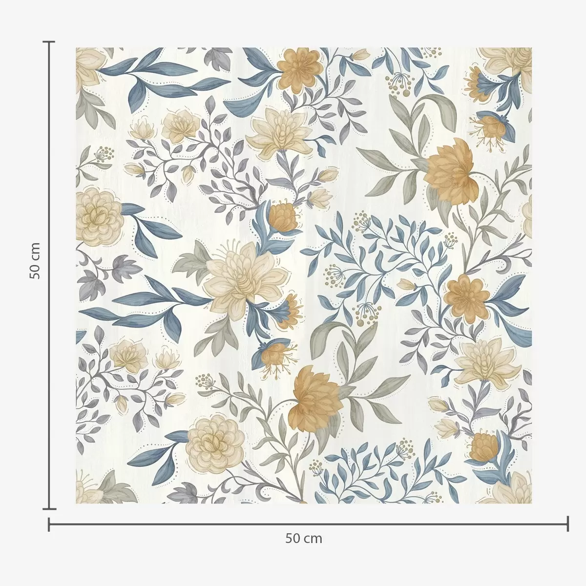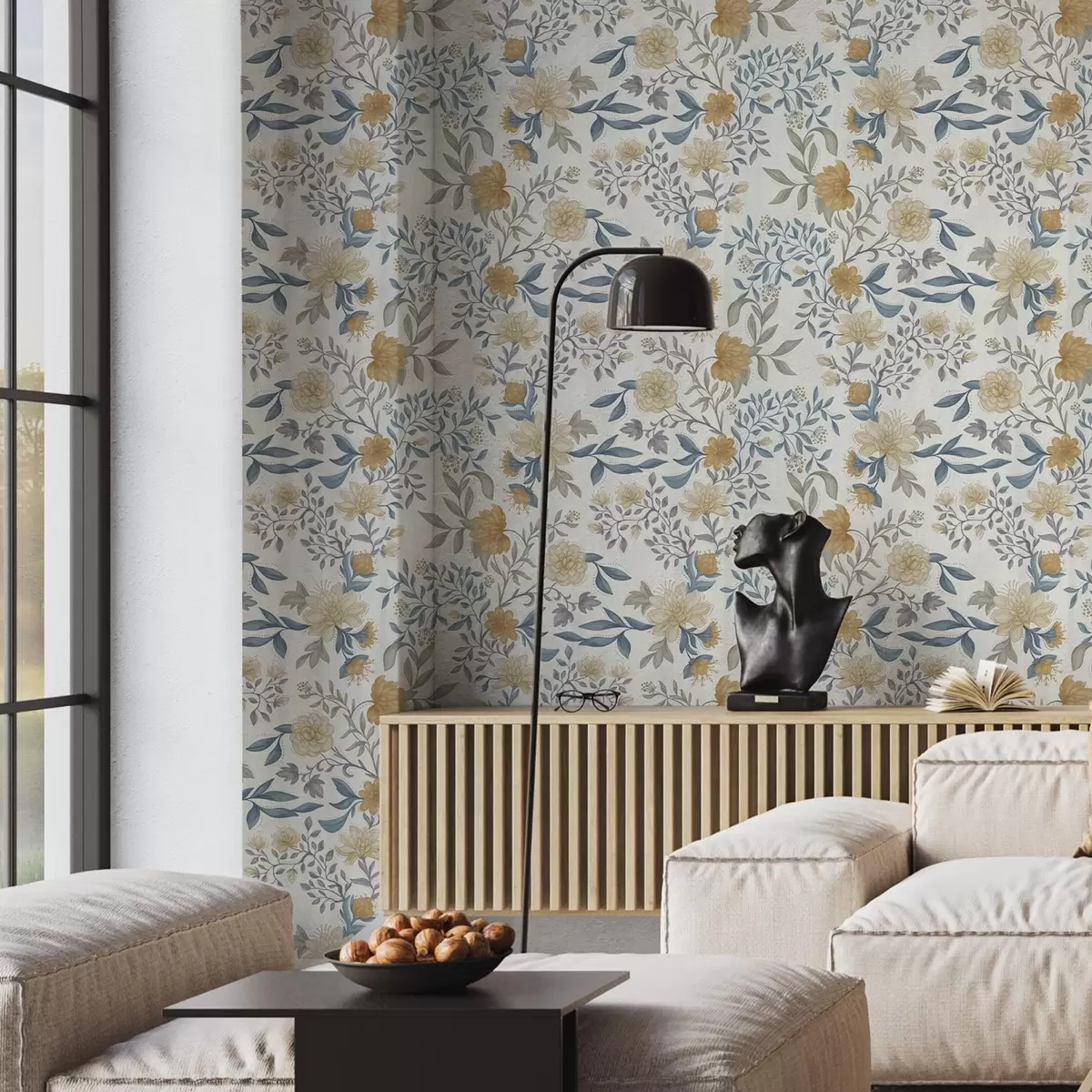 Tapety Żółte kwiaty i niebieska zieleń na mlecznobiałym tle Nr. a00934v2