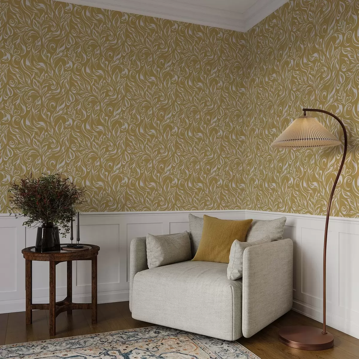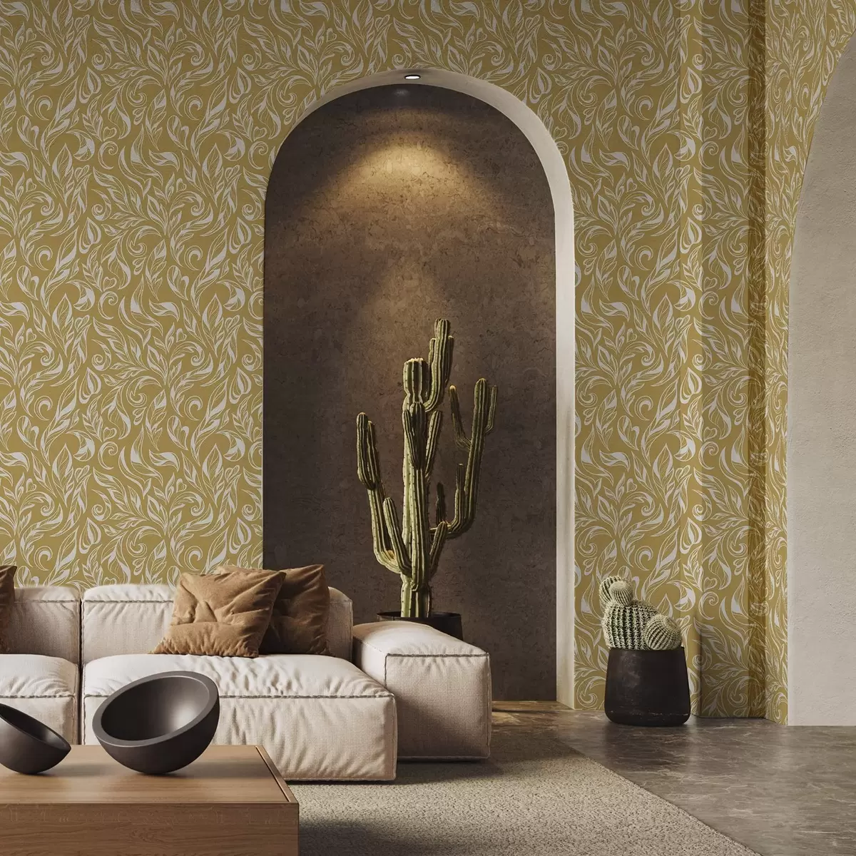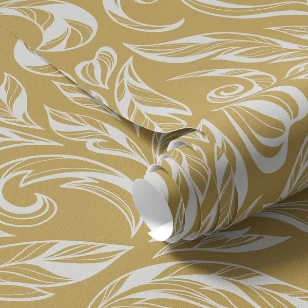 Tapety Kremowo-biała liściasta ozdoba na ciepłym ochrowym tle Nr. a00940v1