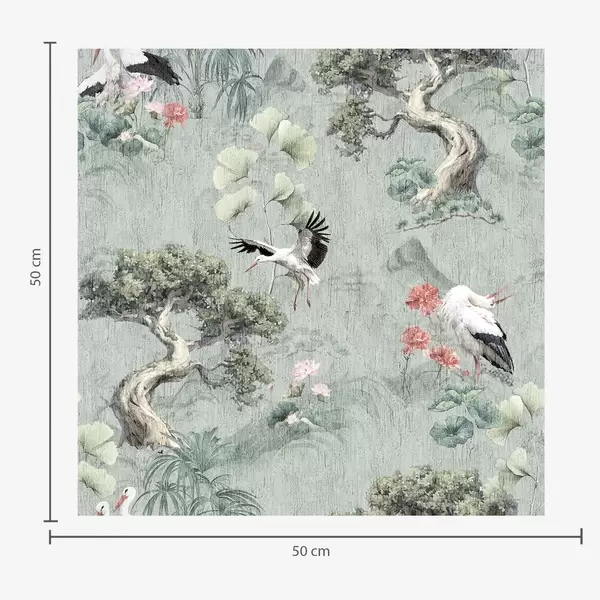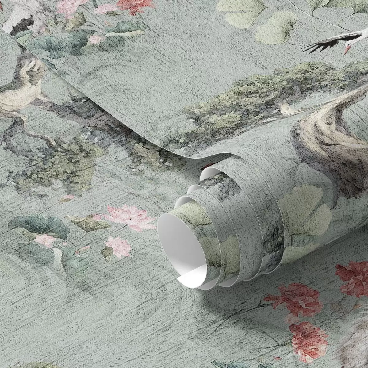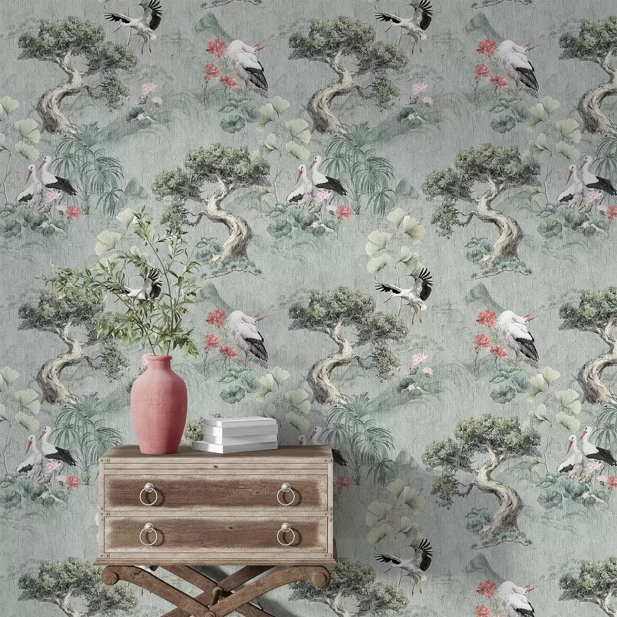 Tapety Żurawie wśród sosen i lotosów na spokojnym zielonym tle Nr. a00962