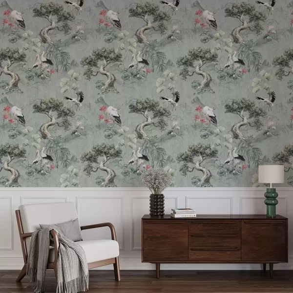 Tapety Żurawie wśród sosen i lotosów na spokojnym zielonym tle Nr. a00962