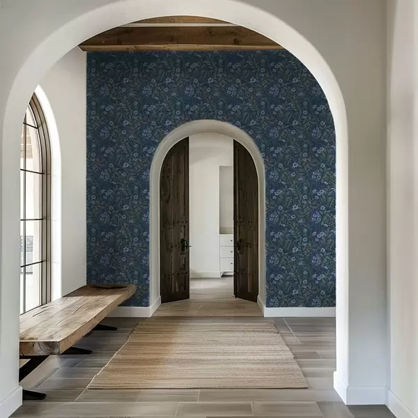 Tapety Jagody w kolorze granatowym i białe kwiaty w gęstym listowiu Nr. a00994