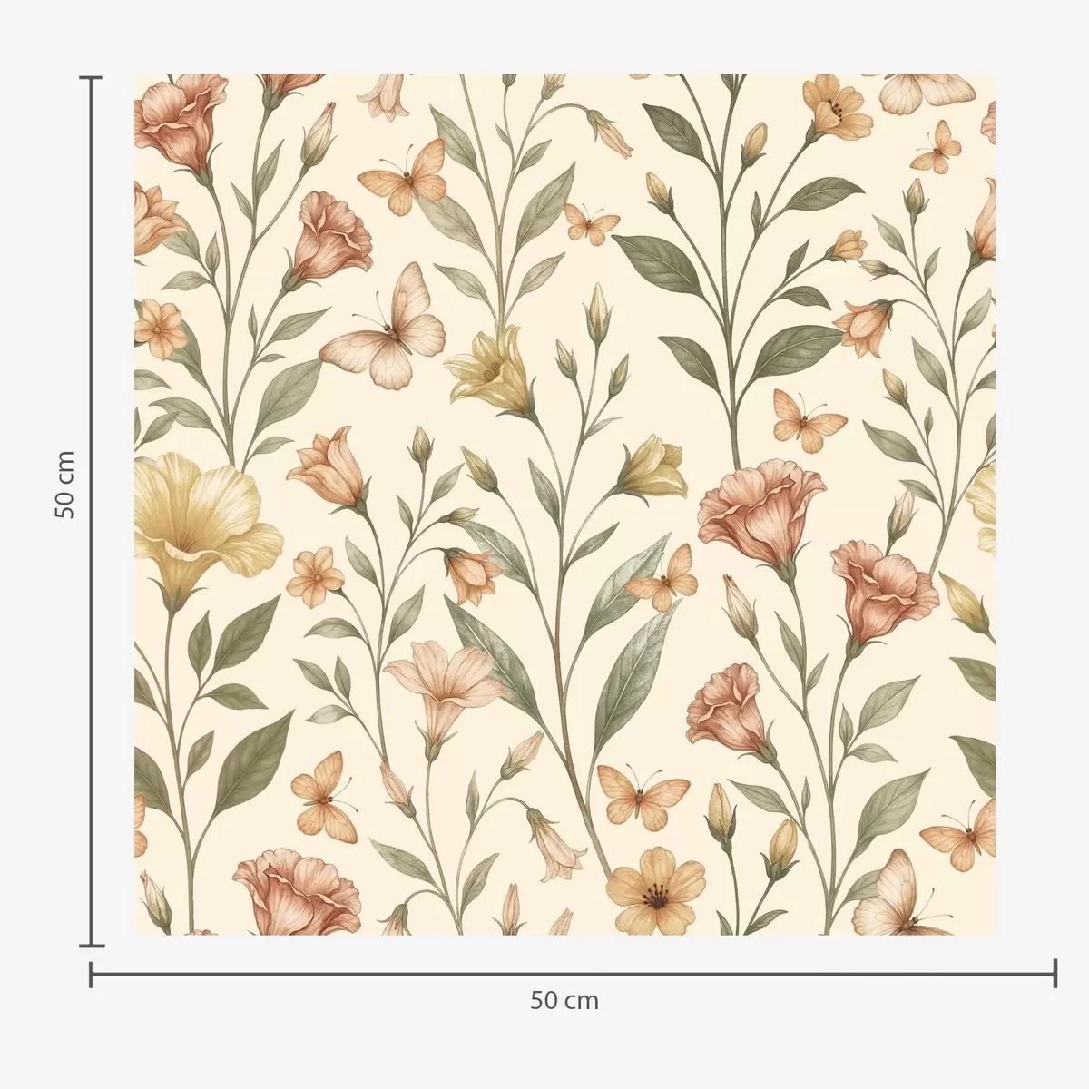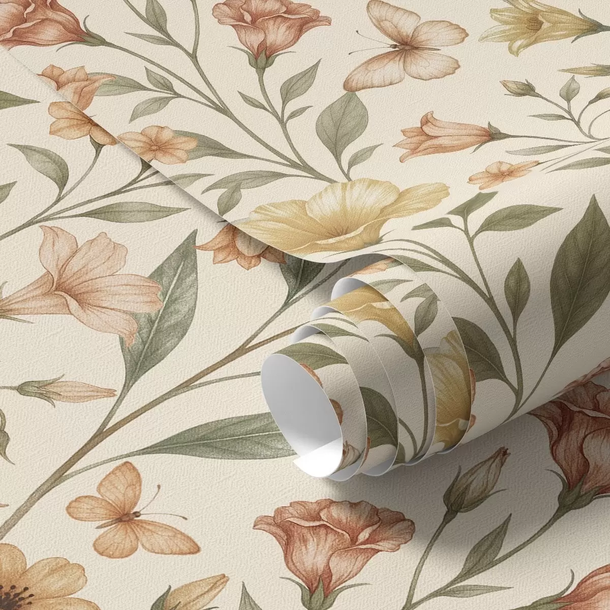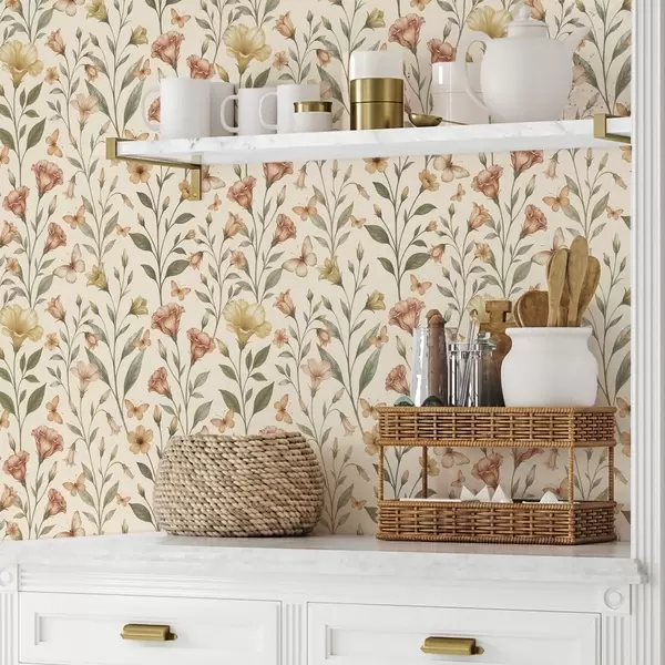 Tapety Delikatne kwiaty brzoskwini i motyle na ciepłym kremowym tle Nr. a01026