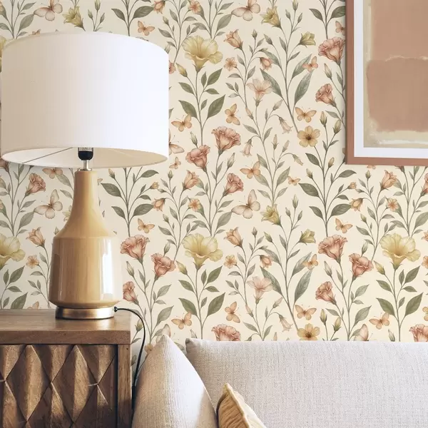 Tapety Delikatne kwiaty brzoskwini i motyle na ciepłym kremowym tle Nr. a01026