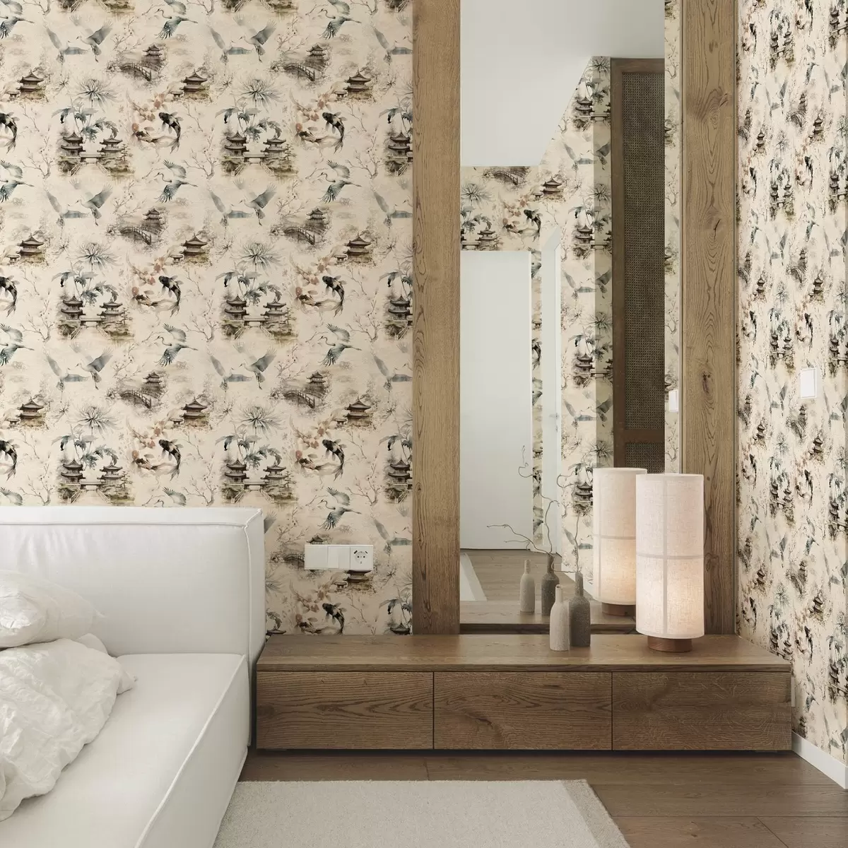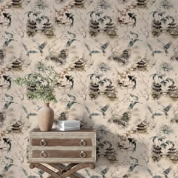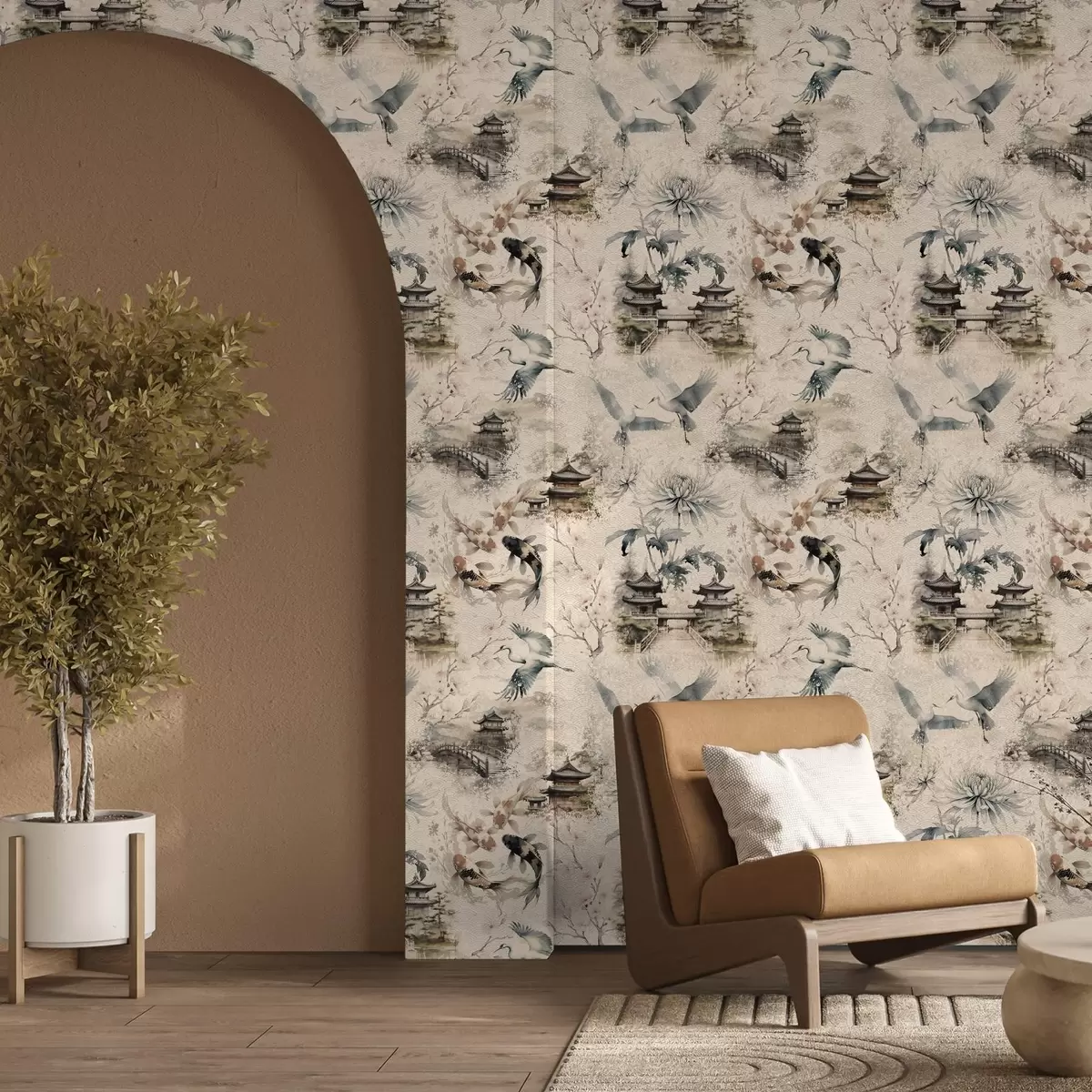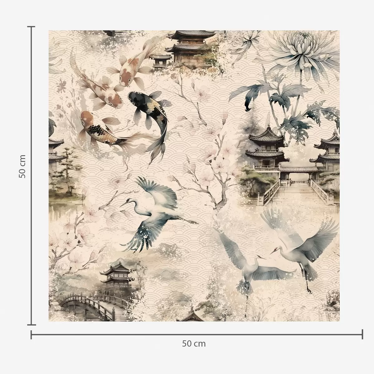 Tapety Japońskie świątynie, karpie koi i żurawie na delikatnym tle Nr. a01040