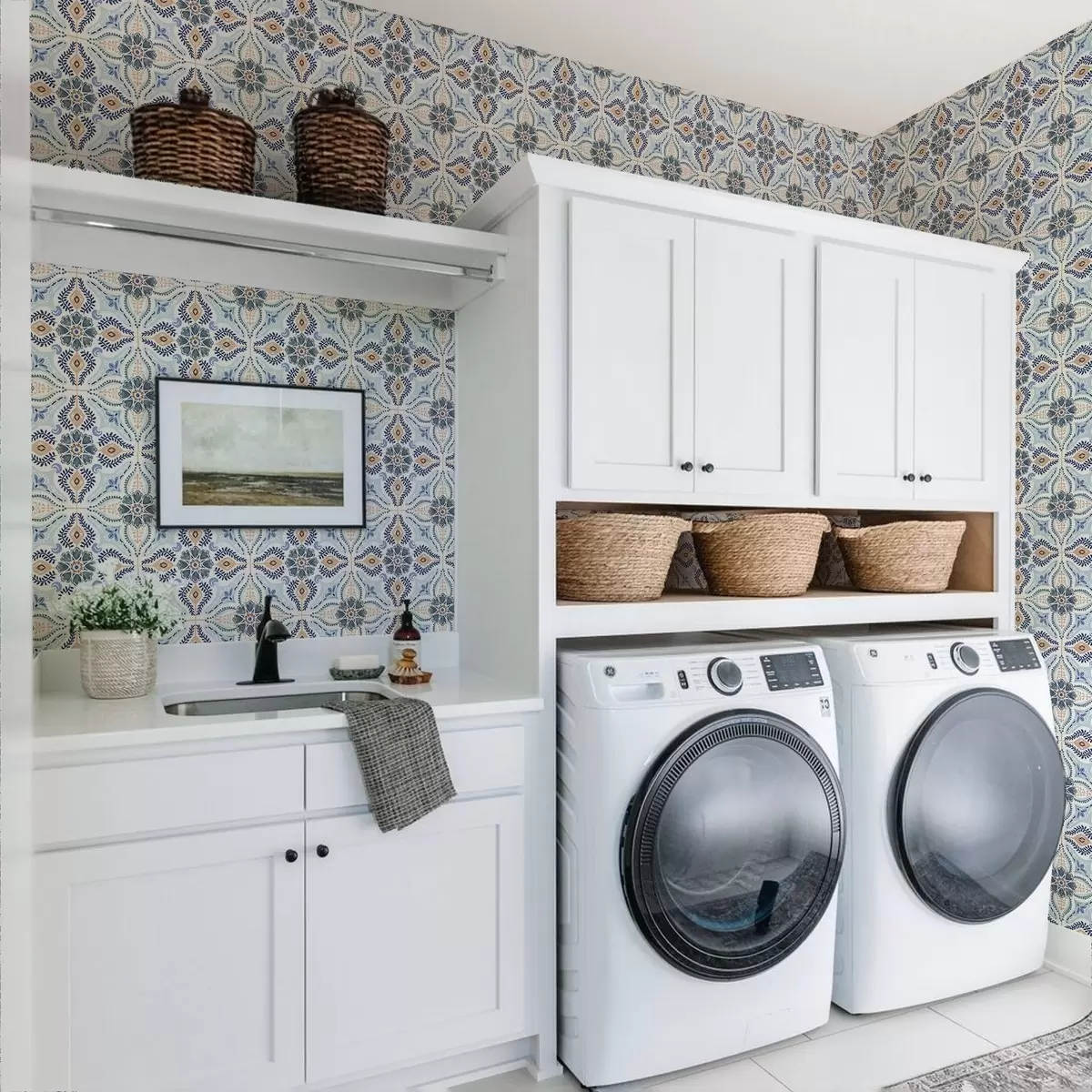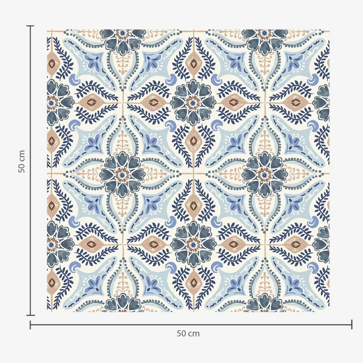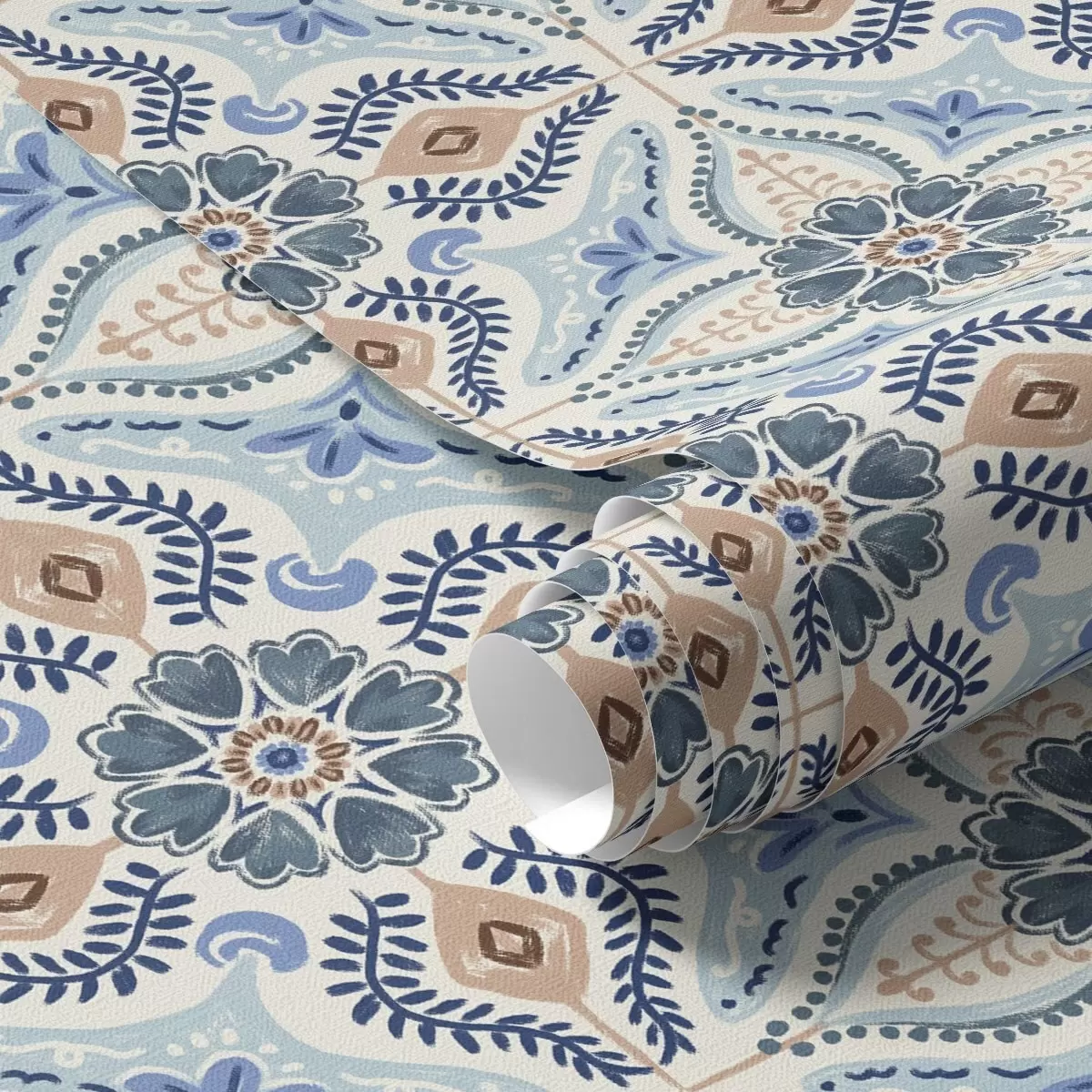 Tapety Niebiesko-beżowy ornament w stylu płytek ceramicznych namalowany akwarelą Nr. a01085