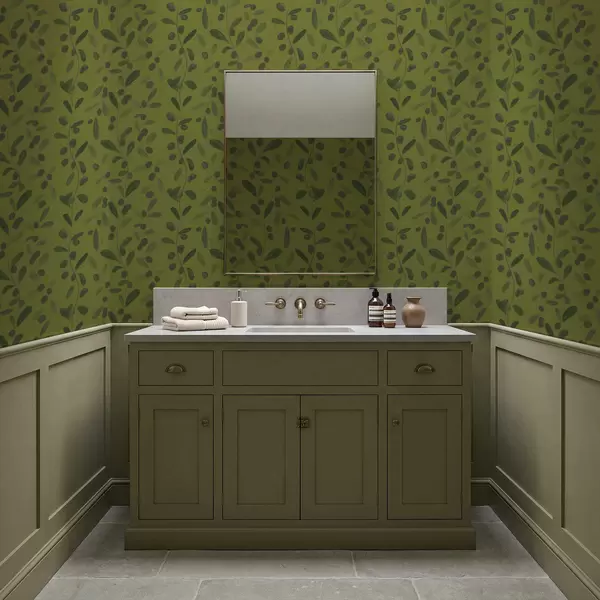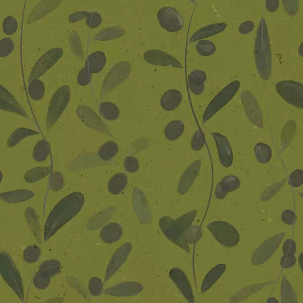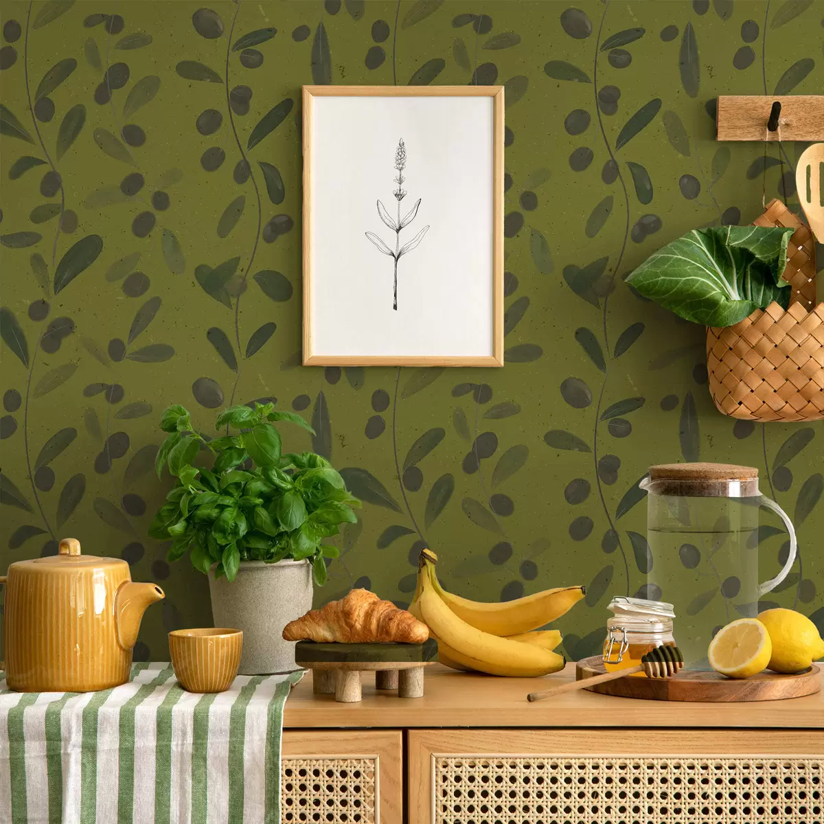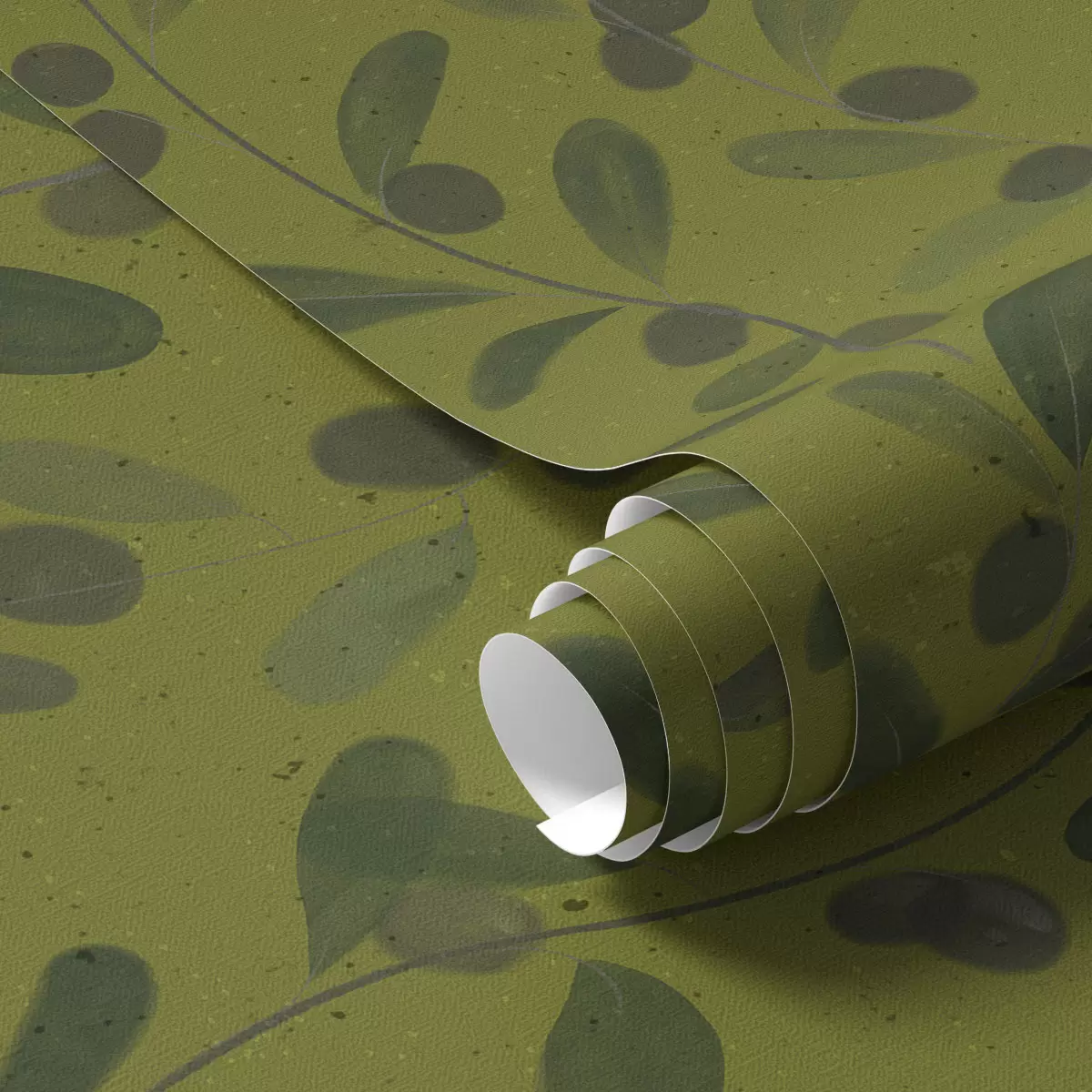 Tapety Zielone gałęzie z liśćmi i jagodami na oliwce Nr. a01113