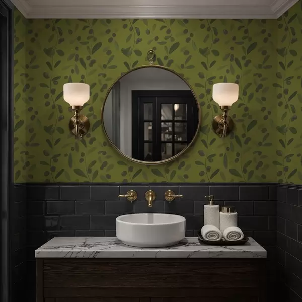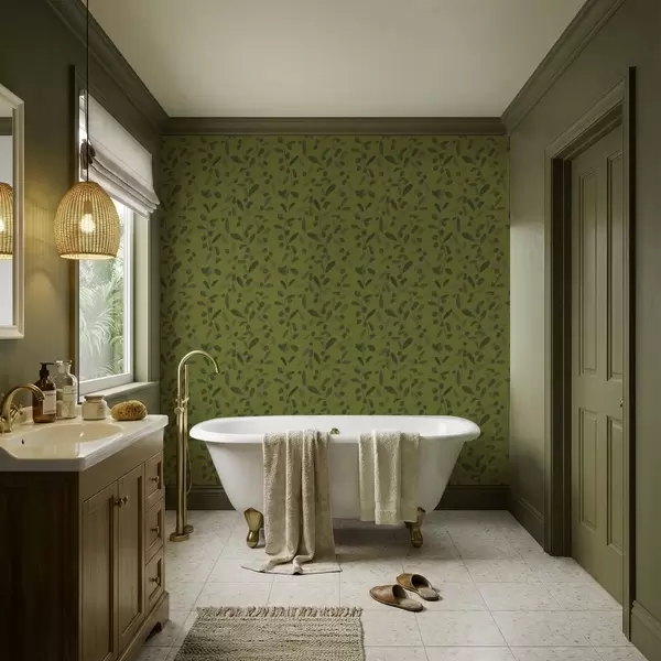 Tapety Zielone gałęzie z liśćmi i jagodami na oliwce Nr. a01113