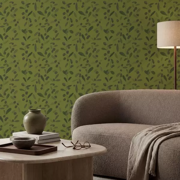 Tapety Zielone gałęzie z liśćmi i jagodami na oliwce Nr. a01113